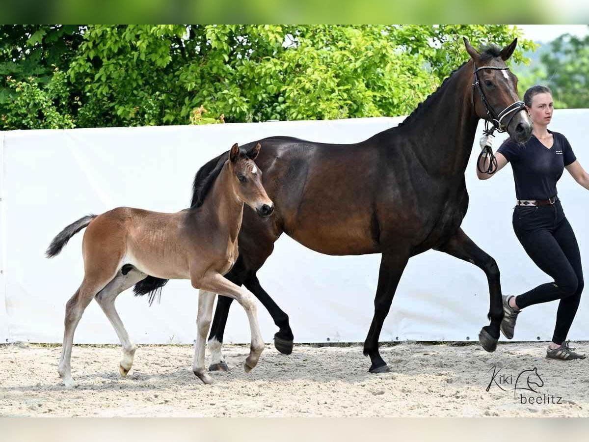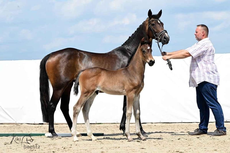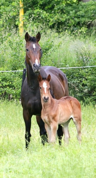 Due to a reduction in herd size, this 8-year-old mare by Zoom x Brentano/Airport, pregnant with Diamantenglanz for early May, is seeking a new home. She was backed at age three, is familiar with stable life and box confinement, and is regularly vaccinated and dewormed. She tends to be somewhat lower in the pecking order.