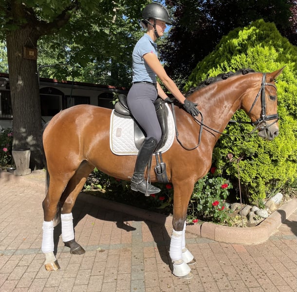 6-letnia gniada hanowerska klacz wierzchowa v. Carridam x Embassy I, 1.68 stm.* Czysta jezdność, przekazuje wspaniałe wrażenia z jazdy z doskonałym ruchem Prawdziwy wierzchowiec i koń treningowy par excellence Zgodnie ze swoim rodowodem ma również zaobserwowano niezwykłą zdolność do skoków Umieszczony test konia ujeżdżeniowego klasy A Prywatna okazja - super cena € 27.500,--