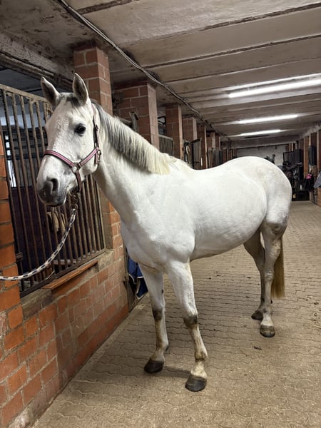 I am offering here a mare standing at 1.64 meters. "Dia" is not a beginner's horse; she is eager to work, but sometimes her head gets in the way. She is quite particular when mounting (unfortunately, she was mishandled during her training), and I have only had her for six months. I've realized that she might not be the best fit for daily riding. During riding, she has no bad habits like rearing or bucking! She is very sensitive and therefore needs someone who can work with her calmly and with horse sense. Loading onto the trailer is no problem, despite a minor incident where she walked through the side of the trailer; according to the clinic, she is fully sound and fit for use. If you're interested, feel free to get in touch!