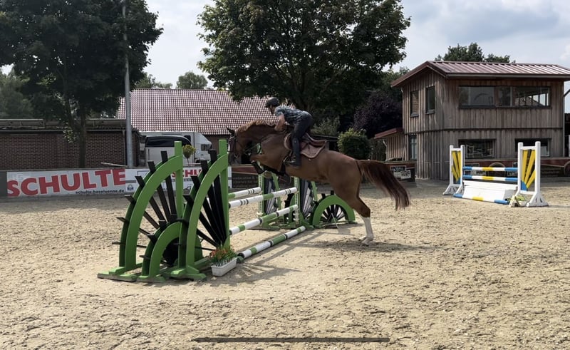 Beautiful, colorful chestnut mare. Show jumping talent with excellent pedigree – mare by Balou Peggio / Balou du Rouet / Silvio I. With a heavy heart, we are looking for a new, suitable 5-star home for my mare (born in 2018, 1.75 m tall). Due to changed life circumstances, I unfortunately lack the time to continue her training to her full potential. She was gently and lovingly backed at the age of four. She is ready for 1.40 m show jumping and has already competed successfully, demonstrating her talent and willingness. ✨ Details & Pedigree: - Sire: Balou Peggio - Grandfather: Balou du Rouet - Dam line: Silvio I She is a highly talented horse for show jumping, eager to work, and eager to be promoted. She enjoys her work immensely and always wants to please. Due to her quality, she is too valuable not to be regularly exercised. She is friendly, affectionate, and interested in people. ❗ Not a desperate sale – only to caring, loving hands. If genuinely interested, I am happy to provide further information.