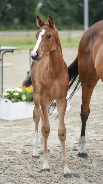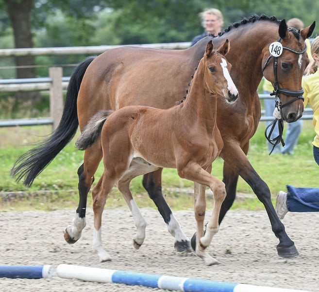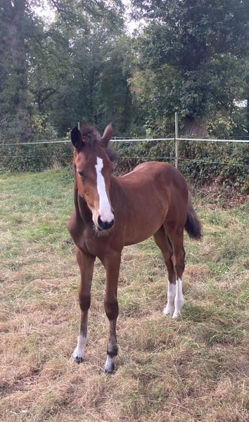 Hannoveraner Stutfohlen mit sehr viel Qualität und Potential für Dressur, Springen und Vielseitigkeit. Preis VB zzgl. Mehrwertsteuer Dieses edle Hannoveraner Stutfohlen vereint moderne Typausprägung, Leistungsbereitschaft, Vermögen und ein wunderbares Interieur. Abstammend von Vidar, doppelt veranlagter Celler Landbeschäler, der großrahmig und mit gutem Talent am Sprung eine lückenlose Karriere als Dressurpferd bis zum Grand Prix vorweisen kann. Seine Abstammungstafel baut auf vornehmlich springbetonten Vorfahren auf, bei deren Selektion auf gute Grundgangarten und unkomplizierte Reiteigenschaften Wert gelegt wurde. Vater Viscount vererbt Rittigkeit und Leistungsbereitschaft und kann über 350 eingetragene Sportpferde vorweisen. Vidar, der für Rittigkeit, Vermögen und Ausstrahlung steht, selbst bis S*** erfolgreich in der Dressur unterwegs ist und über Viscount, Contendro und Edward beste beidseitige Veranlagung mitbringt, wurde hier mit einer holsteinisch geprägten Stute angepaart, die über Quintender x Clinton I genetisch im Springsport den höchsten Ansprüchen gerecht wird. Charakter & Auftreten: Dieses Fohlen zeigt sich aufmerksam, lernfreudig und absolut menschenbezogen. Sie ist bereits total brav beim Schmied und hat beim ersten Mal ohne Zögern die Hufe gegeben – ein echtes Verlasspferd in der Entstehung, das bei uns täglich an der Hand unterwegs ist. Bewegung & Veranlagung: Mit ihrer ausdrucksstarken, bergauf gesprungenen Galoppade, dem kraftvollen Hinterbein und viel Elastizität zeigt sie großes Potenzial für alle Sparten des Sports. Dazu kommt ihre Vielseitigkeit in der Abstammung – beste Voraussetzungen für eine erfolgreiche sportliche Zukunft oder den züchterischen Einsatz. Besonderheiten: • Langbeinig, elegant, mit modernem Typ • Vorsichtig und leistungsbereit • Beidseitige Veranlagung genetisch abgesichert • Springvermögen • Lieb im Umgang und sehr kooperativ • Überdurchschnittliche Grundgangarten, tolle Schwebephase im Trab, große Galoppade mit ausgeprägter Bergauftendenz Unsere Vinnie könnte, wenn alles passt, im Dezember umziehen. Wir freuen uns auf Anschreiben von netten Menschen, die unserem Fohlen ein förderndes Zuhause bieten möchten.