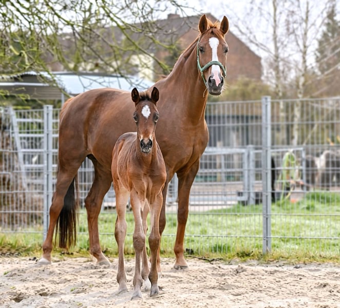 His sire, "Total PS," has already made a successful debut as a breeding stallion, having been Reserve Second Reserve Champion in his young horse test. His sire, "Totilas," demonstrated his athletic prowess with numerous victories in Grand Prix competitions, including wins at the European Championships, World Championships, and the 2010 World Cup Final. The dam, "Skaya fille Du Bonheur," is a daughter of "Sir Donnerhall," who won silver at the World Young Dressage Horse Championships and gold at the Bundeschampionat. Sir Donnerhall has sired over 100 licensed sons and around 100 offspring competing at the Grand Prix level. In further pedigree, the influential full-blood "Lauries Crusador xx" and the stallion "Argentan," renowned for rideability and willingness to perform, are also present. Additional foalings with us may be possible. Feel free to visit our hobby breeding at www.hannoveranerzucht-pickbrenner.de to see more of our breeding program.