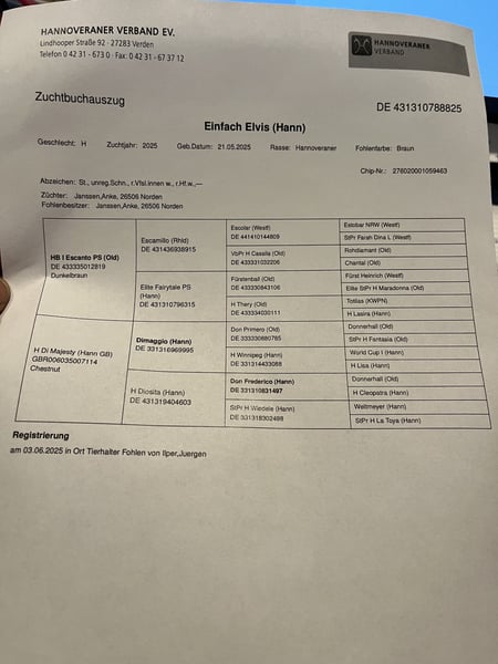 For sale is an extraordinary, large-framed Hanoverian colt of modern type, outstanding movement ability, and an excellent character. A true stallion candidate with high development potential for sport and breeding! Pedigree: Escanto PS x Dimaggio Sire: Escanto PS The Escamillo son Escanto PS impresses with his dynamism, light-footedness, and modern conformation. He is owned by Paul Schockemöhle and is considered one of the most promising young stallions of his generation. ➡️ Grandfather Escamillo was Vice World Champion of young dressage horses and is now successful at Grand Prix level. ➡️ Through Escolar, the proven performance blood of the Westphalian dressage elite flows into his lineage. Dam line (born and raised by Suzanne Davis in England) through Dimaggio – a legend in dressage horse breeding. Dimaggio, himself a World Champion of young dressage horses, has had a lasting impact on breeding through rideability, elegance, and movement quality. ➡️ He is the sire of numerous Grand Prix horses and licensed stallions, including Desperado FRH, Dimaggio Black, and Don Noble. ➡️ The maternal line not only brings performance but also the best character – this foal is attentive, friendly, and uncomplicated to handle. ⭐ Special features: • Large-framed, modern & type strong • Swinging, rhythmic movements • Excellent character – balanced, people-oriented • High-quality genetics for breeding & sport • Correct foundation – stallion candidate with perspective We are happy to send photos and videos upon serious interest. Location: 26506 Norden Please feel free to contact us for more information or to arrange a viewing appointment. An extraordinary colt for connoisseurs and supporters of dressage horse breeding!