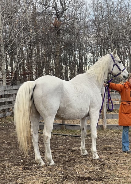 Syren Balou *registration pending (CWBHA) Hanoverian x Oldenburg 2025 Grey Warmblood Colt “Timmy” is an exceptional prospect, whether you’d like to go in the direction of jumping or dressage. Born May 11, and is already a big boy, expected to mature above 16.3HH +. Straight, correct and strong! By Beau Balou, out of Syren MV (Herzzauber x Sinfonie MV). This colt is bred to be a winner. Dam has produced some incredible foals, one getting ready to be shown in the USA. Dam was a high level dressage horse in her younger years. Sire needs no introduction, known for his impeccable temperament, and jumping talent. $9,500 or best offer, if going to a show home. Payment plans available. Would consider trade for barrel prospect. He has been worked with daily, had his feet done regularly and deworming up to date etc. Central Alberta, can help arrange hauling.