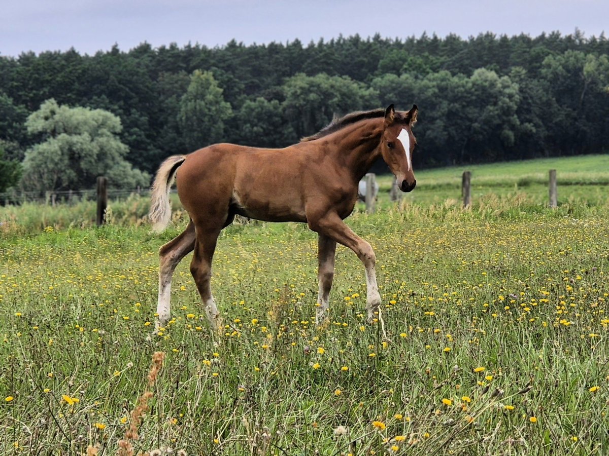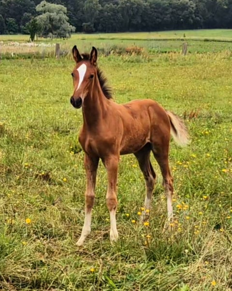 This stunning, athletic colt by Esmeraldo impresses with its expression and charm – with four white socks, it’s a real eye-catcher! The foal already shows a lot of joy in movement, a rhythmic, light-footed canter, and jumps effortlessly around. The stallion has an excellent, jump-oriented pedigree and great potential as a future show jumper. With its lively, confident, and brave nature, it sparks anticipation for its further development! Easy to handle, affectionate, and trusting. The young stallion is regularly handled on the lead, familiar with basic foal training, and in top condition. Regularly attended by the farrier, dewormed, chipped, and in perfect health. Bred with love and care in a private breeding program. We would be happy to show you this magnificent foal in person! Arrangements for a viewing can be made immediately. Feel free to contact us via WhatsApp: +49 176 55323449. His sire is the outstanding Holsteiner stallion Esmeraldo (Völz Stallion Station). Esmeraldo received outstanding scores for his jumping ability in all parts of his stallion performance test, including top marks for willingness to perform (9.3), rideability (9.2), and canter (9.0). He is among the best sons of the Olympic stallion Emerald van't Ruytershof and carries the distinguished bloodlines of Caretino, Lord, and Landgraf. We are confident that Esmeraldo’s exceptional jumping and riding qualities will be passed on to this foal.