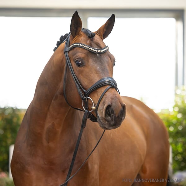 Be my Gold ist ein bildschöner Youngster, der schon rein optisch bei jedem Auftritt die Blicke auf sich zieht. Mit seiner Ausstrahlung und seinem sympathischen Auftreten weiß er auf ganzer Linie zu überzeugen. Auch wenn er mit Abstand der jüngste Kandidat dieser High-Level-Auktionskollektion ist, so ist der Ansatz seines Besitzers und Pferdekenners Heinz Ahlers nachvollziehbar, denn schon als Dreijähriger schaffte es Be my Gold in das Bundeschampionatsfinale. Und die Option, diesen Rohdiamanten bis zum Auktionsende coachen zu können, gefiel seinem Besitzer derart, dass er nun erstmals Verdener Auktionsaussteller wird. Altersentsprechend gefördert zeigt Be my Gold seine Veranlagung auf geraden und ersten gebogenen Linien. Auf den ersten Blick sind der Galopp und der Schritt die absoluten Höhepunkte des Hengstes; sein Lernwille und seine Rittigkeit lassen den Trab aber auch schon je nach Einwirkung des Reiters im lockeren Grundtrab sowie mit kraftvoll kadenziertem Ablauf darstellen. Im Umgang wirkt Be my Gold sowohl zuhause als auch bei seinen Turnierstarts inklusive Übernachtungsturnieren lässig, händelbar und gleichzeitig wach. Sportname: Be my Gold 2 Sporterfolge: RPF: 2/5. 1/3. 1/4. 1/5. 2. Generation Sportpferde Dressur: gek. Hengst Best of Gold Son v. Best of Gold (DRE: M* mit Ella-Alea Maulhardt,Championat f. Reitpferde 2018,Verden 2016,HM 2016: 120.000 €,Prä.Dre. Körung Verden 2016). Auktionspferde: Fürst Sun v. Fürst Nymphenburg (FoVA 2015). 3. Generation Sportpferde Dressur: Boogie Woogie 9 v. Best of Gold (DRE: Grand Prix mit Maja Puschmann,Dressurprüfung Kl.S*** mit Piaffe und Passage 2025); Schoko Gold v. Serano Gold (DRE: S* mit Stefanie Hohenhorst); Royal Dinaro v. Royal Diamond (DRE: M** mit Pia Linke); Belrano Gold v. Belissimo M (DRE: M mit Shawna HARDING). Aufbauprüfungen Dressur: Batotelli Gold v. Best of Gold (DRE: M mit Birte Ahlers); VbPr Evita Gold v. Belissimo M (DRE: M mit Nele Lübbehusen); Endless Love/Endless Love Bec v. Best of Gold (DRE: L); Ella Gold v. Balesteros (DRE: L); Royal Grey v. Royal Diamond (DRE: L). 4. Generation Sportpferde Dressur: Bellini Gold v. Belissimo M (DRE: Grand Prix mit Yvonne Appen,Dressurprüfung Kl. S*** - Grand Prix de Dressage 2019); gek. Hengst Bugatti Gold/Bugatti Gold OLD v. Best of Gold (DRE: S* mit Thomas Birnbrich,Championat f. Reitpferde 2020,Sonderaufnahme 2020); Lana del Rey 3 v. L' Espoir (DRE: M** mit Hannah Marquardt); Sir Sundance 2 v. Sungold (DRE: M** mit Bettina Wittler); gek. Hengst Sterngold/Sterngold 5 v. Sungold (DRE: M* mit Maria Rohe,Vechta 2011). Aufbauprüfungen Dressur: Sol de Color v. Sezuan (DRE: M mit Sebastian Albers); gek. Hengst Special Gold v. Sandro Hit (DRE: M mit Dorothee Schneider,Dressurpferdeprfg. Kl.M Bundeschampionat 6 jährige 2010,Bundeschampionat f. Reitpferde 2008,MS-Handorf 2007); OLHPrA Edwina Gold/Edwina Gold OLD v. Best of Gold (DRE: L); Emmy Mae v. Zackerey (DRE: L); Zabaione Al Moscato v. Zack (DRE: L); Dein Gold v. Diamo Gold (DRE: L); VbPr Enya la Rose v. Rosengold (DRE: L); Bertolli Gold v. Bretton Woods (DRE: L); Sir Sancho 3 v. Serano Gold (DRE: L); gek. Hengst Landjuwel Gold v. Landadel (DRE: L,Bundeschampionat f.Reitpferde o.M. 1997,Oldenburg 1997). gekörte Hengste: gek. Hengst v. Vitalis - Sezuan v. Vitalis (Verden 2025,VA 2025); gek. Hengst Total Unique v. Totilas (Verden 2023,Prä.Dre. Körung Verden 2023). Auktionspferde: Just Magic v. Jameson RS2 (VA 2024); Zarino v. Zack (VA 2025). Bes. Prämientöchter: HannPrA Fashion Girl v. Fürstenball; HannPrA Zarita v. Zackorado; HannPr Showgirl v. Sezuan; StPr Emotion/Emotion 16 v. De Niro. 5. Generation Sportpferde Dressur: Exupery/Exupery 1 v. Ex Libris (DRE: int. Grand Prix mit Caroline Kottas-Heldenberg,Grand Prix Special-international- 2006,Bundeschampionat f.Reitpferde o.M. 1997); Bakarigold OLD v. Belissimo M (DRE: Grand Prix mit Eike Bewerungen,Dressurprüfung Kl.S*** mit Piaffe und Passage 2025); gek. Hengst Sungold/Tannenhof's Sungold v. Sandro Hit (DRE: int. S** mit Anja Plönzke,Vechta 2005); Don Gasparo v. De Niro (DRE: S** mit Ella-Alea Maulhardt,Nationenpreis Dressur Kl.S Junge Reiter -international- 2013,Nationenpreis Dressur Kl.S Junge Reiter -international- 2013,Nationenpreis Dressur Kl.S Junge Reiter -international- 2006); gek. Hengst Best of Gold v. Belissimo M (DRE: S*** mit Birte Ahlers,Vechta 2013); gek. Hengst Rosengold/Rosengold OLD v. Rohdiamant (DRE: S*** mit Yvonne Reiser,Vechta 2008); VbPr Evergold v. Don Schufro (DRE: S** mit Marie Westphalen); Extra Klasse/Extra Klasse 2 v. Landjuwel Gold (DRE: S** mit Patricia Merveldt); gek. Hengst Dream of Gold/Dream of Gold 3 v. Danone I (DRE: S* mit Nele Lübbehusen,MS-Handorf 2019); gek. Hengst Serano Gold v. Sandro Hit (DRE: S* mit Laura Haßler,Bundeschampionat f.Reitpferde m.M. 2004,Vechta 2005); gek. Hengst Diamond Gold/Diamond Gold 3 v. De Niro (DRE: S* mit Birte Ahlers,Championat für Reitpferde o.M. 2004,Vechta 2004); Worcester 11 v. Welt As (DRE: S mit Henschke,Miriam); Welwitsch v. Weltmeister (DRE: S mit Jacobi,Henriette); Balicor Gold v. Bretton Woods (DRE: M** mit Nadine Seebauer); Quotengold OLD v. Quantensprung (DRE: M* mit Nele Lübbehusen); OLHPrA Extragold/Extragold OLD v. Belissimo M (DRE: M* mit Birte Ahlers,Championat f. Reitpferde 2020); Del Sogno v. Diamond Hit (DRE: M* mit Tjana Heider). Sportpferde Springen: Gappeloup v. Grundstein II (SPR: M mit Brockhausen,Constanze von). Aufbauprüfungen Dressur: Balvino Gold v. Belissimo M (DRE: M mit Birte Ahlers); gek. Hengst Diamo Gold/Diamo Gold OLD v. Dimaggio (DRE: M mit Yvonne Reiser,Vechta 2009); OLHPrA Escala Gold/Escala Gold OLD v. Belissimo M (DRE: L,Finalteilnehmer Bundeschampionat 3j.Reitpferde 2021,Bundeschampionat f. Reitpferde 2021); Just Gold v. Jazz (DRE: L). Aufbauprüfungen Springen: Good-Luck 4 v. Seydlitz (SPR: L). gekörte Hengste: gek. Hengst Toto Nation De Jeu v. Toto Jr. (Australien 2022); gek. Hengst Deus/Christel's Deus v. De Niro (Oldenburg 2001). 
