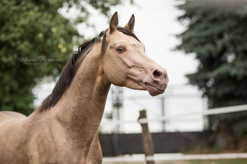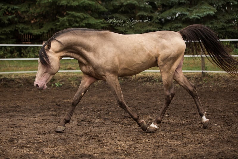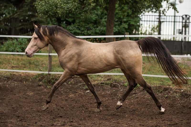Arabisches Partbred | Amber Champagne | 2009 | 148 cm 93,75 % Araberblut | Zugelassen bei ECHA-ESV (7,8 - HB I), EASP, ZSAA, VZAP, ZfDP, AES, Zangersheide, IFCE Genetisch getestet: SCID, CA, WFFS und PSSM2 - negativ | ECVM-Studie 2022: unauffällig (röntgenologisch) Khaffee Kharamel GF ist ein kompakter Hengst mit seltenem Amber-Champagne-Farbgen. Er vereint arabischen Ausdruck mit guter Rittigkeit, Übersicht und einem klaren Fundament. Im täglichen Handling zeigt er sich umgänglich, erfahren und ausgeglichen. Er kennt Robusthaltung auf der Weide und Kontakt zu anderen Hengsten. Er stammt väterlicherseits vom bekannten KHALVIN KHLEIN KpM ab. Die Mutter ist eine bewährte Vollblutaraberstute (*1993) aus der Zucht Hägerhof (Walter Dill), vielfach erfolgreich im ZSAA und VZAP eingesetzt. Seine Nachzucht ist europaweit vertreten - auch im Warmblutbereich.