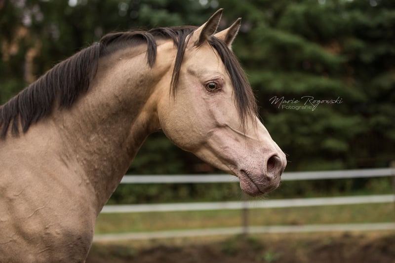 Partbred arabe | Amber Champagne | 2009 | 148 cm 93,75 % de sang arabe | Approuvé par l'ECHA-ESV (7,8 - HB I), l'EASP, la ZSAA, la VZAP, la ZfDP, l'AES, Zangersheide, l'IFCE Testé génétiquement : SCID, CA, WFFS et PSSM2 - négatif | Étude ECVM 2022 : sans particularité (radiographie) Khaffee Kharamel GF est un étalon compact à la rare robe ambre champagne. Il allie l'expression arabe à une bonne maniabilité, une bonne vue d'ensemble et des fondements solides. Au quotidien, il se montre sociable, expérimenté et équilibré. Il est habitué à la vie robuste au pré et au contact avec d'autres étalons. Il descend du célèbre KHALVIN KHLEIN KpM du côté paternel. Sa mère est une jument pur-sang arabe (*1993) éprouvée, issue de l'élevage Hägerhof (Walter Dill), qui a remporté de nombreux succès dans les concours ZSAA et VZAP. Sa descendance est présente dans toute l'Europe, y compris dans le domaine des chevaux à sang chaud.