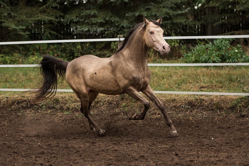Arabskie Partbred | Amber Champagne | 2009 | 146 cm 93,75% krwi arabskiej | Zarejestrowany w ECHA-ESV (7,8 - HB I), EASP, ZSAA, VZAP, ZfDP, AES, Zangersheide, IFCE Testy genetyczne: SCID, CA, WFFS i PSSM2 – negatywne | Badanie ECVM 2022: bez zmian (rentgenologicznie) Khaffee Kharamel GF to kompaktowy ogier o rzadkim kolorze Amber Champagne. Łączy arabskie wyrafinowanie z dobrą jazdnością, przejrzystością i solidnym fundamentem. W codziennym kontakcie jest łagodny, doświadczony i zrównoważony. Zna trudne warunki na pastwisku i kontakt z innymi ogierami. Jego ojcem jest znany KHALVIN KHLEIN KpM. Matka to sprawdzona pełnej krwi arabskiej klacz (*1993) z hodowli Hägerhof (Walter Dill), wielokrotnie odnosząca sukcesy w ZSAA i VZAP. Jego potomstwo jest obecne na terenie całej Europy – także wśród koni typu czołowego.