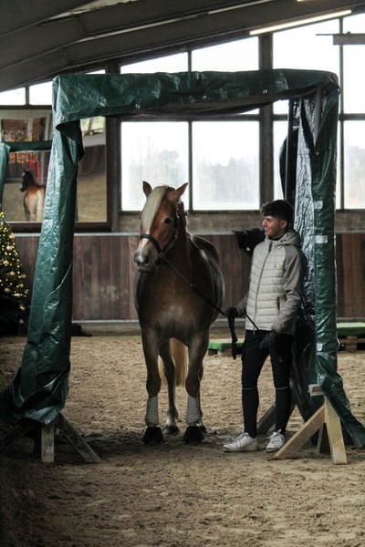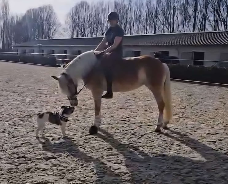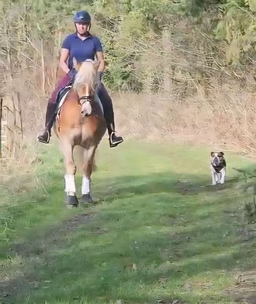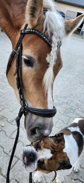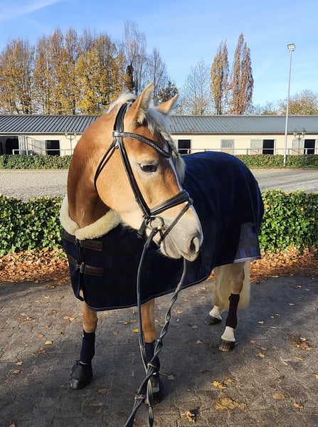 Fédérine est une jeune jument haflinger très typée, dotée d’excellentes qualités équestres. Elle provient d’une petite élevage en Süd-Tirol, où la reproduction est menée avec succès depuis des décennies, avec seulement deux juments. Les lignées de cette élevage ont déjà produit de nombreuses juments hautement primées, et Fédérine a été sélectionnée pour le championnat des foals, où elle a reçu une haute distinction. En Allemagne, elle n’a pas encore été présentée ou enregistrée comme poulinière, mais elle est candidate à la primée et constitue donc un potentiel intéressant pour la reproduction. En Süd-Tirol (région de Bolzano), elle a passé l’été en liberté dans le troupeau sur les alpages, avant d’être rapatriée en Allemagne. Elle est désormais sous selle et se montre très volontaire et désireuse d’apprendre. Elle est obéissante, robuste nerveusement, et possède suffisamment de mobilité pour être entraînée sportivement. Son beau physique, associé à ses trois allures de base de qualité, laisse envisager une future carrière prometteuse en dressage. Actuellement, elle est uniquement en selle dans ses trois allures fondamentales, ce qui indique qu’un perfectionnement supplémentaire est nécessaire dans tous les domaines. Toutefois, nous prenons déjà plaisir chaque jour à travailler avec elle, et elle reste motivée, répond bien aux exercices et participe volontiers. En raison de son niveau d’éducation, elle n’est pas adaptée à des enfants ou des débutants pour le moment et nécessite encore une formation spécialisée. En plus du travail en dressage en manège et en carrière, elle a acquis une bonne éducation générale : elle se laisse facilement charger, reste calme lors de la ferrure, connaît les chiens, les tracteurs, le nettoyage à l’eau, le travail avec des barres et des cavaletti, et a participé à un stage d’Horseagility, qu’elle a brillamment réussi. Elle a été radiographiée avec d’excellents résultats en mai 2024, et montre une robustesse comparable à celle de sa croissance initiale. Elle n’a jamais été malade et aucune anomalie n’a été constatée. Elle est mesurée à 148 cm avec des fers, mais grâce à sa constitution solide, elle peut également accueillir des cavaliers plus grands.