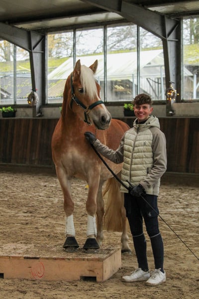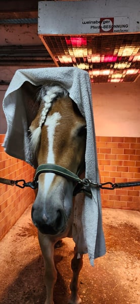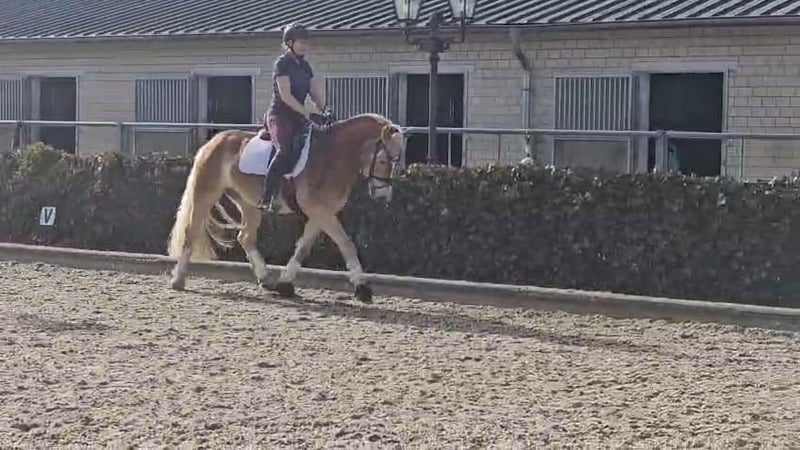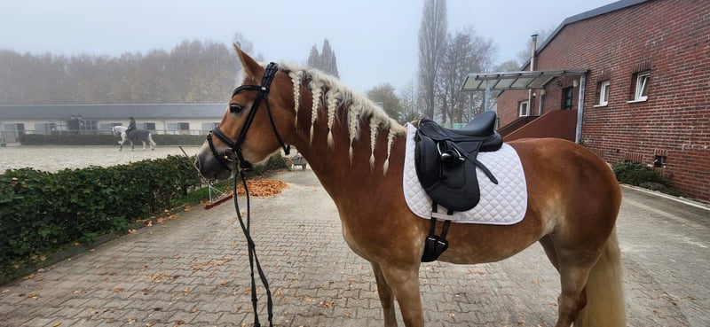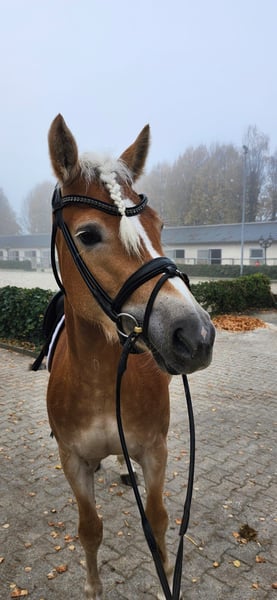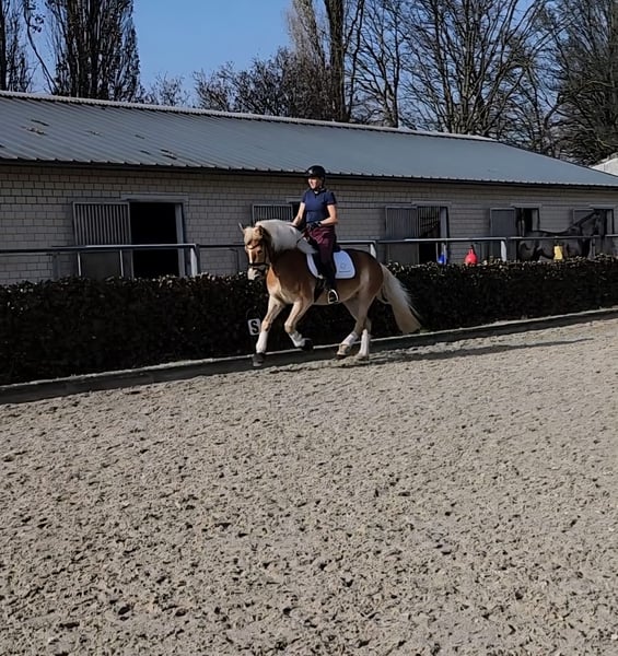 Feder is an exceptionally typy young Haflinger mare with excellent riding qualities. She comes from a small breeding farm in South Tyrol, where a very successful breeding program has been maintained for decades with only two broodmares. The mare lines cultivated there have produced numerous highly decorated mares, and Feder was qualified for the foal championship and awarded high premiums there. In Germany, she has not yet been presented or registered as a broodmare, but she is a premium candidate and therefore quite interesting for breeding purposes. In South Tyrol (region of Bolzano), she was able to spend the summer freely grazing in the herd on the alpine meadows before we brought her to Germany. She is now backed and shows great eagerness and willingness to learn. She is well-behaved and resilient, yet has enough forward movement to be worked on a sport level. In addition to her beautiful exterior, she has three good basic gaits, making further dressage training a promising prospect. Currently, she is ridden in all three basic gaits, so further training in all areas is needed. Nevertheless, we enjoy working with her every day, and she is always motivated to solve tasks well and participates willingly. Due to her current training level, she is not suitable for children or beginners at this time and requires further professional development. Beyond dressage work in the arena and on the round pen, she has gained a solid general education. She loads very well, stands quietly at the blacksmith, and is familiar with dogs, tractors, rinsing, pole work, cavaletti, and has participated in a Horseagility course, where she handled all tasks flawlessly and with confidence. She has already been radiographed with excellent results (05/24) and shows the same robustness as in her previous upbringing. She has never been ill and we have found no abnormalities. Currently, she is officially measured at 148 cm with shoes, but her solid build allows her to comfortably carry larger riders.