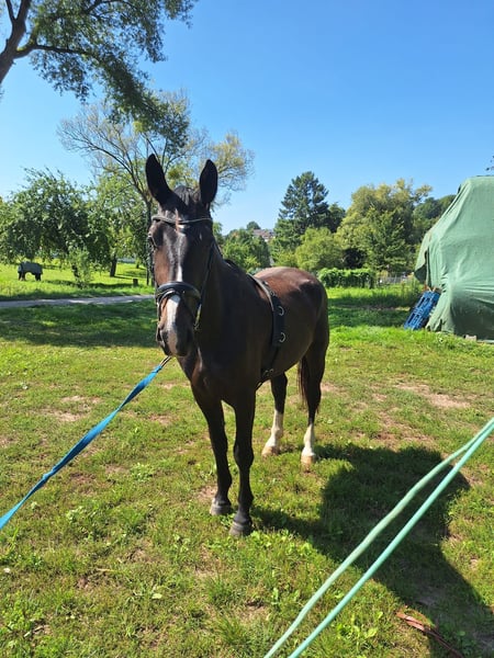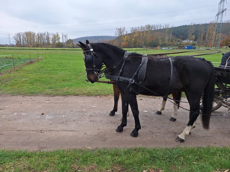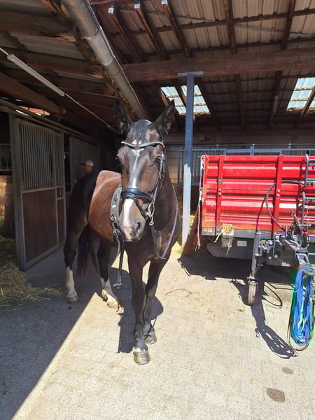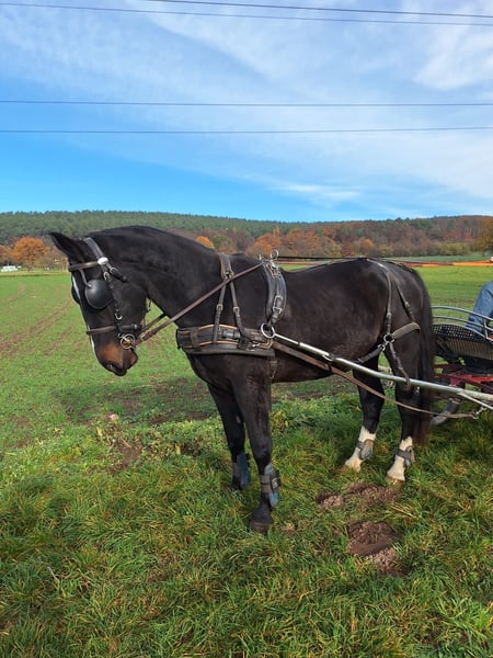 Verkaufen unseren fast 4 jährige Wallach Elmiro.Er ist momentan 1.63 groß, ist ein - und zweispännig gefahren und absolut Verkehrssicher. Ist bei uns seit dem Fohlenalter aufgewachsen, leider passt er nicht zu unseren Gespannen.