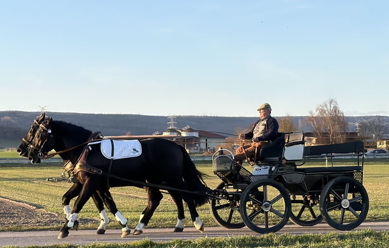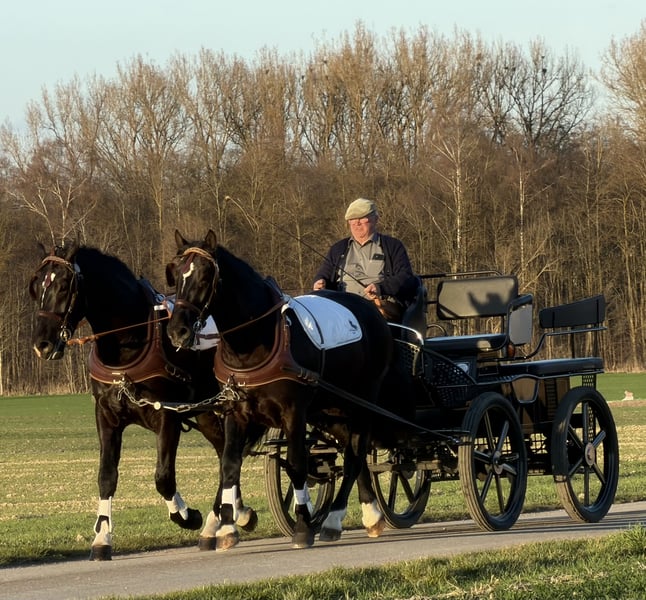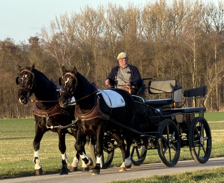 Hier sehen Sie ein Gespann ( Stute rechts Wallach links) das sehr gelassen und vernünftig ist. Beide Pferde sind ein ,- zweispännig gefahren, sowie im Gelände und in der Halle geritten . Beide Pferde können auf Wunsch auch einzeln erworben werden.