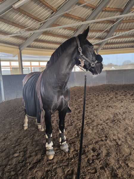 Hallo, ich verkaufe hier meinen 2018 geborenen schweren Warmblutwallach Valentino, auch liebevoll Eselchen genannt. Valentino ist ein Pferd was immer neugierig auf neue Dinge ist und gern Freude an der Arbeit hat. Er benötigt eine konsequente Führung, da ihm sonst schnell, viel Quatsch einfällt. Regelmäßige und abwechslungsreiche Arbeit, wie Dressurarbeit, Springen und auch mal mit dem Hänger irgendwo hinfahren und Ausreiten gehen, gefällt ihm sehr. Er wurde vierjährig angefangen einzufahren, dies wurde aber meinerseits nicht weiter gefördert, ich denke aber das ihm die Arbeit auch viel Freude bereiten würde. Er setzt neu gelernte Dinge schnell um und ist immer gewillt alles richtig zu machen. Er läuft mit einem entsprechenden Reiter solide auf A Niveau und beherrscht fliegende Wechsel. Das Springen macht ihm sehr viel Freude, hier springt er einen E Parcours oder macht auch mal gern Stangengymnastik. In letzter Zeit waren wir selten im Gelände, da wird leider zum Ausreiten immer weiter weg fahren müssen. Ich würde mir für ihn einen Platz wünschen, wo er täglich weiter gefördert wird, viel mit anderen Artgenossen raus kommt und man ihn einfach lieb hat. Ich verkaufe ihn nicht aus der Not heraus, sondern einfach, weil ich nicht mehr die nötige Zeit durch Arbeit und Studium finde und er ein Zuhause verdient hat, wo er täglich betüddelt und gefordert wird. Valentino ist sehr ranghoch und war bis über sein viertes Lebensjahr hinaus Hengst. Bei uns steht er mit einem Kumpelwallach täglich draußen und Nachts in der Box. Stuten oder andere Wallache die nebenan stehen, sind für ihn kein Problem, größeren Herdenkonstellationen überfordern ihn aber. Allesamt ist Valentino ein Pferd mit dem man sehr viel Freude habe kann und der jeden Spaß gern mitmacht. Er wird nicht an Händler oder Schulbetriebe verkauft! Für ein Probereiten berechne ich 20 €, was im Falle eines Kaufs, verrechnet wird.