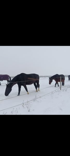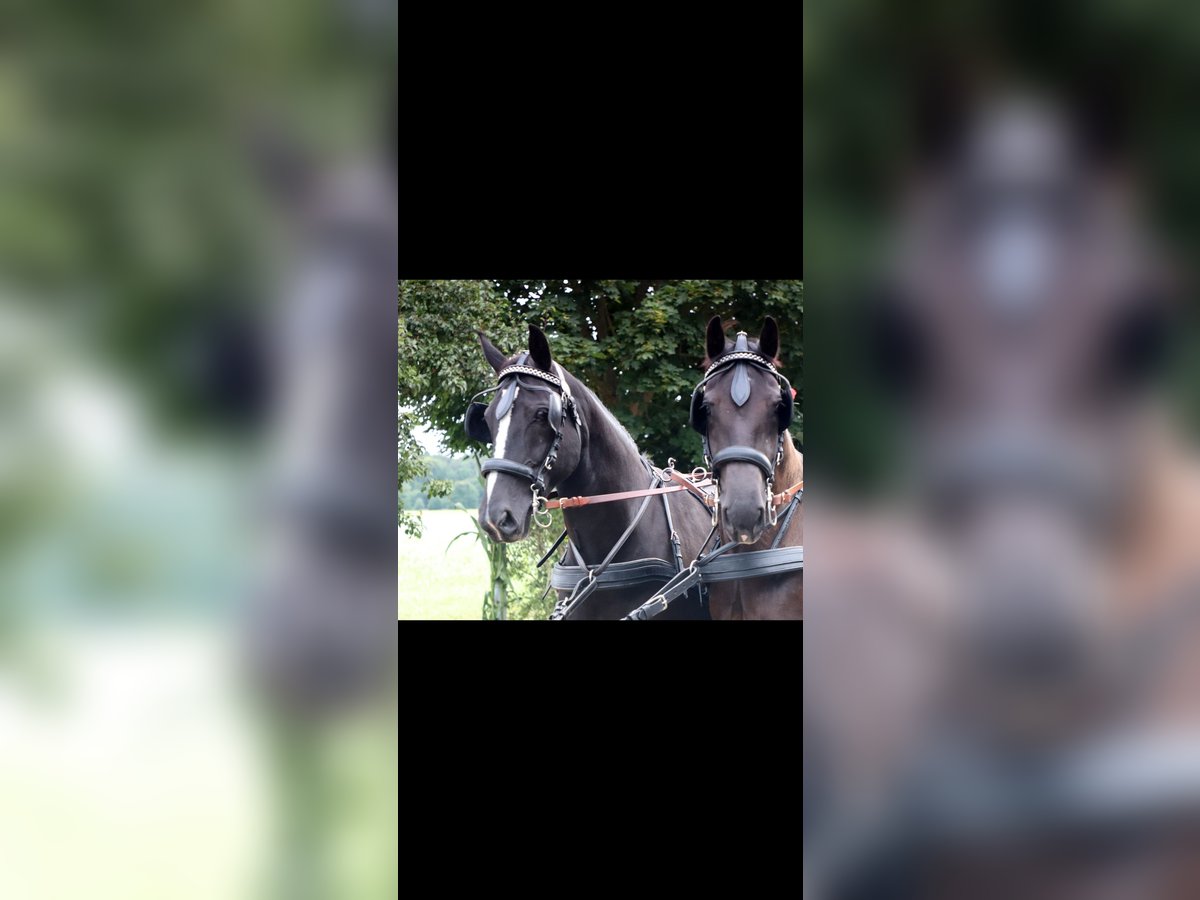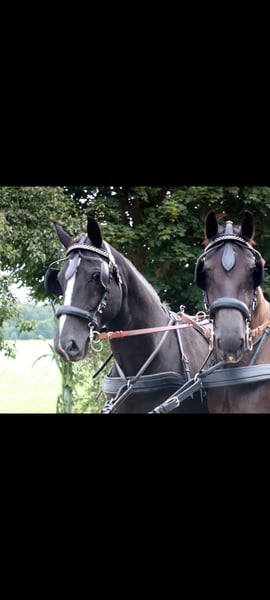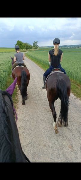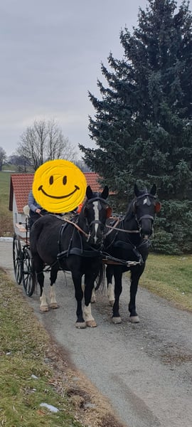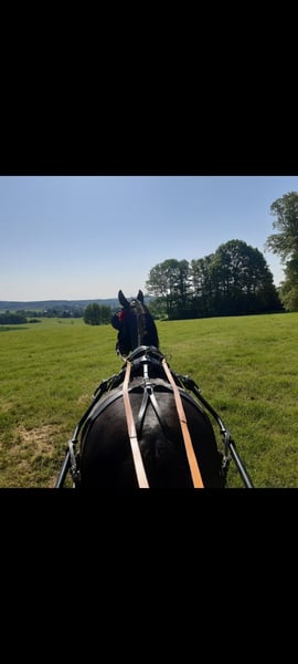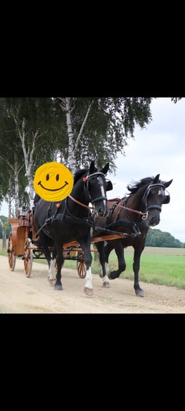 Ein neues Zuhause als Freizeit Fahr- und Reitpferd sucht die 2009 geborene Schwere Warmblutstute Gloria. Sie ist ca 1,64 m groß und besitzt eine sehr schöne dunkle Rappfarbe. Sie hatte bereits Fohlen. Wir haben sie im Frühjahr 2025 als Schulpferd sowohl zum Reiten als auch zum Fahren gekauft und sie ist vorm Wagen wirklich das ideale frische und dennoch gelassene Freizeitpferd. Auch unter dem Reiter macht sie im Gelände großen Spaß mit gutem Vorwärtsdrang ohne dabei heiß zu werden. Was ihr jedoch keine wirkliche Freude bereitet ist die Dressurarbeit, vor allem in der Reithalle und auch die dortige Galopparbeit, wenn man dies öfter die Woche möchte, was im Winterhalbjahr leider im Schulbetrieb meistens der Fall ist. Die Abwechslung im Sommer mit Geländereiten und vor allem Fahren bekommt ihr deutlich besser, dann ist sie auch beim dressurmäßigem Reiten motivierter, vor allem bei Reitern die eine sehr ruhige Zügelführung haben. Sie steht zwischen anderen Stuten in einer Paddockbox und geht mit diesen auch in einer größeren Gruppe auf die Koppel oder Paddock. Krankheiten sind uns keine bekannt. Videos eingespannt vom Vorbesitzer vorhanden. Zwei Jahre ältere Stute (braune) als Gespannpartner könnte mit dazu erworben werden.
