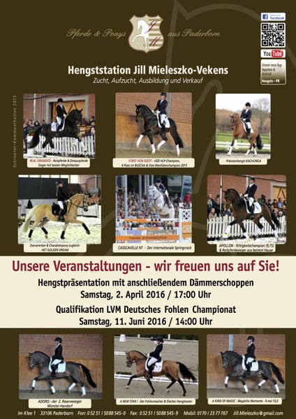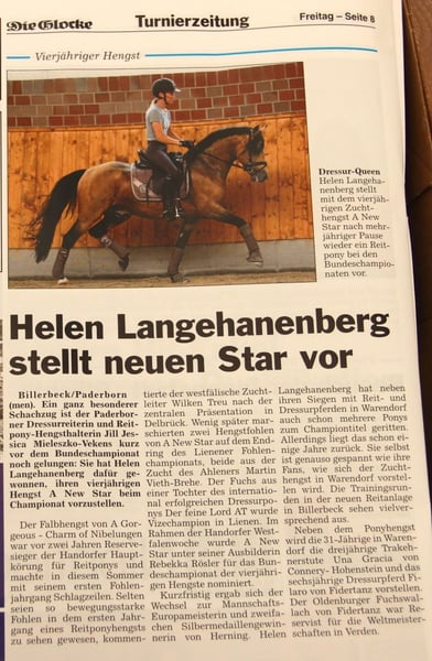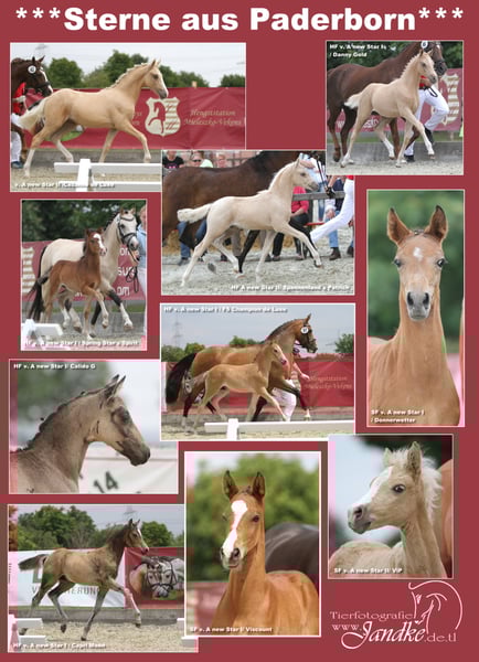 Een nieuwe ster I - motion wonder, veulen & hengst r van speciale! Westfaalse, * 04.04.2009 (DR) DUN, grootte: 146 cm Fokker: Marion Reimers, 33649 Bielefeld Een nieuwe ster ster het voor de eerste keer naar aanleiding van de veulen-show in Steinhagen scheen, waar hij de zon wil schijnen ondanks de stromende regen met zijn motie genie leugens. Als een top veiling veulen van 20. NRW veulen veiling in 2009 vond hij de weg naar Paderborn. Elke voorstelling een triomf, hij is altijd menigte pleaser. Op de Westfaalse hengst Licensing pony 2011 was hij waarschijnlijk 1 reserve kampioen, voor zijn spectaculaire draf, kreeg hij het merk 10.0 (!). Het voormalige fokken directeur Dr. Friedrich Marahrens op dat moment prees hem zeer en was in vervoering: "Tien teenen, dat was gisteren en vandaag een tien draf (10.0), hoe doe je beter...? I can't tell you om dit te doen. Spectaculair tijdens het verkeer, ook met de rust nodig uitgerust, maar besloot toen, als hij moet uitvoeren... Als genoemde ideale grootte. goed kader" En vervolgens voegde hij de cruciale woorden, waarvan de betekenis duidelijk is tot vandaag. Het was een aanbeveling voor alle fokkers en degenen die had geluisterd naar en volgde de aanbeveling, in het jaar dat volgt beloond met uitzonderlijke Colt geweest. Marahrens geformuleerd bijna psychisch: "U kunt verheugen ons reeds nu op zijn eerste veulens wanneer kijk allemaal zo uit van de Wasserij en ga draf als de vader, is het een grote vintage. We kan alleen maar hopen dat genoeg merries naar lopen..." Korte, Dr. Friedrich Marahrens moet houden juiste! Einde van juni 2013 A nieuwe ster in Delbrück zijn eerste veulens gepresenteerd. Het was een grote vintage niet alleen zoals geprofeteerd, zijn veulens was sensationeel in alle aspecten. Interieur, type expressie, karakter, en uiteraard de kwaliteit van de beweging van de veulens was adembenemend. Fok directeur WANA waren net zo enthousiast als de fokkers en toeschouwers in Delbrück Treu en de merries Commissie tonen. De feiten: drie ontvangen toelating tot de Westfaalse veulen veiling in Münster-Handorf van tien veulens op de show van de Mare in Delbrück forum and the Pony voor de Adelheitsdorfer auktion-kaapte een veulen terwijl de bovenste Colt in Münster, en een van de hochpreisigsten veulen van Adelsheitsdorf pony veiling. De andere zes veulens verkochten op dat moment al of niet op de markt waren. Werden geregistreerd in Westfalen 12 veulens en gepresenteerd: -Het was een nieuwe vier merries Toon winnaar in Lüdinghausen, Ostönnen, en Delbrück (kampioen merrieveulen en kampioen Colt), Star vier veulens werden gepresenteerd op kwalificaties aan het Duitse veulen kampioenschappen, alle vier in aanmerking kunnen komen met de hoogste score. Twee een nieuwe ster die Colt door Martin Vieth gefokt kwam onder de beste 5 Duitsers pony veulens in Lienen, met inbegrip van de Duitse vice-kampioen 2013혼다 Voordat het kwam in juni een echte sensatie van kwalificatie. Niet alleen ´ dat in Warendorf, Attendorn en Lüdinghausen op slechts een dag drie A nieuwe sterren children met de hoogste rangen en kwalificatie overwinningen het ticket voor de finale op de Duitse veulen kampioenschappen beveiligd, Nee, won een nieuwe ster veulen door Martin Vieth is in lüdinghausen, Duitsland de kwalificatie met historische, ongekende 90 punten, dat is 9 keer de maximale Note10, 00. Dat heeft er nooit in de geschiedenis van het Duitse veulen kampioenschappen! Van deze eerste veulen geboren in 2013 is uitgegroeid en werd geïntroduceerd in het najaar 2015 op de RAS-enquêtes. Nieuwe ster A versteld staan met zijn zonen in de korrels vallen 2015. Uit zijn eerste veulens 2013 7 Colt uit was gegaan door die waren - 6 ontvangen goedkeuring goedkeuring en ten slotte 5 en alle 5 licentie een indrukwekkende balans. De eerste een nieuwe ster kinderen onder het zadel met grote mogelijkheden, excellenter rittigkeit en een eersteklas interieur inspireren. Turniersportlich A nieuwe ster succesvol is geweest in dressuur en test de klasse bereikt een overwinning in zijn eerste dressuur paard A. In de kampioenschappen van Westfalen hij eindigde op de vijfde en vertegenwoordigde Duitsland op de Duitse federale kampioenschappen. Nieuwe ster van de bij de federale kampioenschappen, A bereden door kampioen Helen Langehanenberg. Ondanks een sterke prestaties en een grote receptie, waarvan we ook veel later in het jaar ontvangen, is de kans op een medaille geweigerd deze Hochkaräterpaar die zeer dicht bij de finale over. De gedetailleerde beschrijving van de wortel van de moeder vindt u op een nieuwe ster volle broer een nieuwe ster II. In het seizoen 2014 kwalificatie onder de 13j. Marei LIEGT tweemaal voor het Bundeschampionat in Warendorf, was meerdere malen in dressuur van klasse A geplaatst en zegevierend. Even 2015 kon hij weer met James voor het Bundeschampionat kwalificeren en werd door de vrouwen genomineerd Conny Endres aan het pilot project van de "pony" kampioenschap in Verden, waar hij kwam naar de finale, en vervolgens werd geplaatst in daar. Was een succesvol seizoen met overwinning afgerond A en L dressuur. Een nieuwe ster die ik dekking in de natuurlijke paring Stud vergoeding: 450 euro