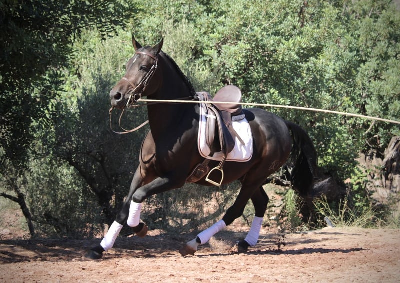 Este hermoso caballo de alzada en capa oscura, un potro absolutamente confiable, tanto en el ring como en el campo. TROYA es un compañero leal en todos los aspectos de la vida, muy sociable, fácil de montar, bien educado y compatible con otros caballos... casi no hay una cualidad positiva que no se aplique a este magnífico ejemplar. ¡Solo le falta un hogar maravilloso para alcanzar su plena felicidad! ¿Quién desea ofrecerle un lugar especial a este elegante caballo? TROYA está correctamente entrenado en los pasos básicos, domina el trabajo en la shoulder-in y los desplazamientos laterales, y continúa siendo entrenado por mí de manera profesional. Además, se desenvuelve muy bien en grupo, pero también en solitario en el campo. TROYA es un Hispano-Árabe con pasaporte español. Ubicación: Valencia, España.