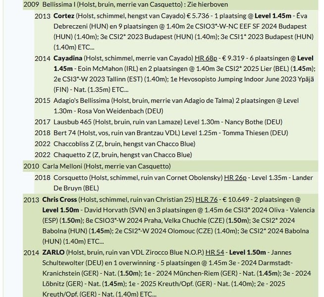 Ona jest siostrą półbratem dwóch koni Grand Prix o wzroście 1,60 m: ogiera Calippo oraz olimpijskiego mistrza Carlo 273, który odniósł wiele sukcesów pod Nickiem Skelton, a później Sergio Alvarez Moya, z 9 zwycięstwami i 66 miejscami na poziomie CSI 5* 1,60 m*. Jest także siostrą półbratem koni Chris Cross (1,55 m) i Zarlo (1,45 m). Pochodząca z renomowanej linii stam 318A2, Bellissima już udowodniła swoją wartość jako doskonała matka hodowlana, z czterema potomkami startującymi w sporcie, w tym Cayadina (1,45 m) z mistrzynią Europy Wilmą Hellström oraz Cortez (1,55 m) z młodym węgierskim jeźdźcem. Matka Bellissy, Gunda IV, będąca wnuczką legendarnego Casalla przez jej ojca Casqueto, jest siostrą półbratem T-Cantura II (1,50 m) oraz kuzynką Lighteningtrail (1,60 m GP z Dieterem Mehrensem). Status eksportu: Europa – nie jest możliwy eksport zarodka poza Europę. Koszty transportu ponosi kupujący.