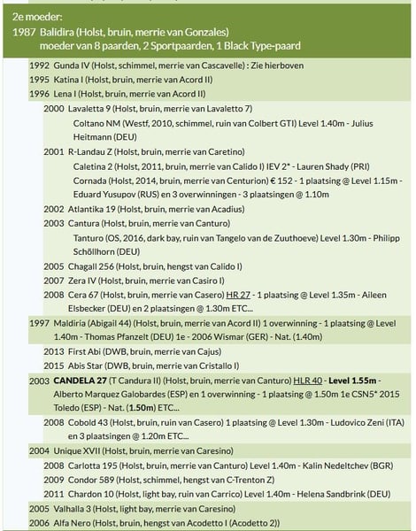 Sie ist die Halbschwester zweier 1,60 m großen Grand Prix-Pferde: dem Hengst Calippo und Olympiasieger Carlo 273, die unter Nick Skelton und später Sergio Alvarez Moya große Erfolge erzielten, mit 9 Siegen und 66 Platzierungen auf CSI 5* 1,60 m Niveau. Außerdem ist sie Halbschwester von Chris Cross (1,55 m) und Zarlo (1,45 m). Als Nachkomme des renommierten Stamm 318A2 hat sich Bellissima bereits als Top-Zuchtstute bewährt, mit vier Nachkommen im Sport, darunter Cayadina (1,45 m) mit der europäischen Meisterin Wilma Hellström und Cortez (1,55 m) mit einem ungarischen Nachwuchsreiter. Die Mutter von Bellissima, Gunda IV, eine Enkelin des legendären Casall über ihren Vater Casqueto, ist Halbschwester von T-Cantura II (1,50 m) und Nichte von Lighteningtrail (1,60 m GP mit Dieter Mehrens). Exportstatus: Europa – Es ist nicht möglich, das Embryo außerhalb Europas zu exportieren. Die Transportkosten trägt der Käufer.