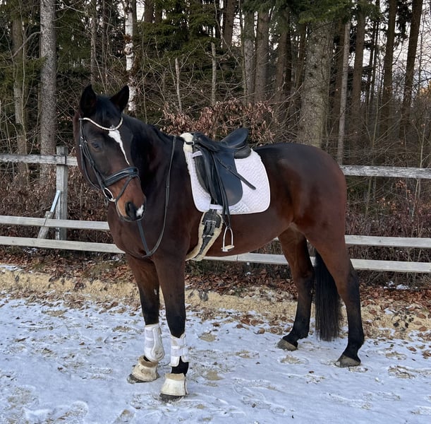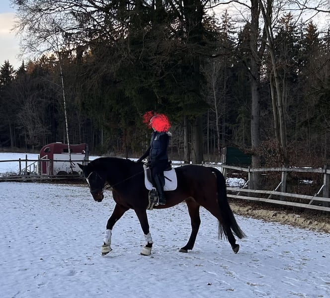 Holsteiner Gelding – Perfect for Leisure and Dressage For sale is a stunning bay Holsteiner gelding, born in 2013. Standing at 17.4 hh, he impresses with his elegant appearance and calm temperament. He has smooth, rhythmical movements. The horse delights with his friendly nature. He also enjoys jumping exercises and is never spooky around poles or other obstacles. He is well-socialized with other horses and currently lives in an open stable with daily turnout on pasture. Please feel free to contact me for more information or if you are interested.