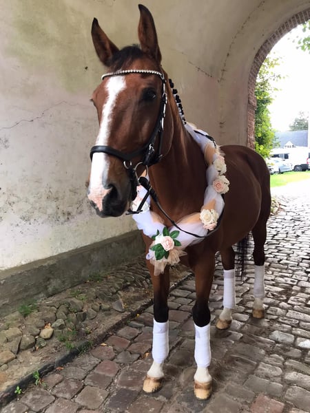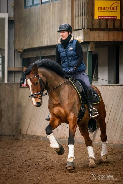 Comme je ne parviens pas à concilier bébé et cheval et que Sir Louie est malheureusement mis de côté depuis un certain temps, je cherche pour lui un nouveau foyer aimant. Louie est à un niveau solide en dressage et en saut d'obstacles, avec des exercices isolés du niveau L également disponibles en dressage. Il est sûr sur la route, sort sans problème en extérieur, connaît le parc d'extérieur et la plage. Je suis propriétaire de lui depuis 2012 et il passe ses nuits dans un box et ses journées en groupe de hongres sur pâturage/paddock. Je ne l'ai pas eu avec des juments, donc je ne peux pas évaluer son comportement à cet égard. Il n'a pas de vices, ne monte pas, ne cabre pas, ne mord pas et ne fait pas d'autres bêtises. Il a cependant le nécessaire pour être amusant. Le transport en van ne pose aucun problème, il s'adapte également à des manèges ou des lieux inconnus, a déjà participé à quelques compétitions, connaît déjà le mors et se laisse tondre sans problème. Il a toujours été vacciné (tétanos, grippe, herpès) et vermifugé quatre fois par an. Il a également été maintenu en forme par des amies et ma cavalière, donc il est actuellement en entraînement. Maintenant, les "mais" : En 2016, nous avons eu des problèmes d'ulcères gastriques. J'ai fait traiter cela et depuis que les symptômes ont disparu, je n'ai plus fait de gastroscopie. Louie a eu des lésions tendineuses aux membres antérieurs en 2017 et 2025, que j'ai fait traiter par thérapie par cellules souches. Les deux blessures ont guéri sans complications et ne le limitent pas. Son sabot antérieur gauche est un sabot contraint depuis sa naissance, c'est pourquoi je l'ai toujours ferré à l'avant. Il n'a cependant pas besoin de fer spécial pour le moment. Sur pâturage/herbe, il a tendance à avoir des obstructions de l'œsophage, c'est pourquoi je ne le laisse manger de l'herbe qu'avec un filet à foin. Je souhaite que ces points de son passé soient également notés dans le contrat de vente. Je ne peux pas juger s'il est adapté aux enfants, il n'a pas encore eu de contact avec des enfants, mon bébé est encore trop jeune pour le cheval. Il m'est très difficile de me séparer de lui, car j'ai pris cette décision uniquement pour des raisons de bon sens. Je ne le confierai pas à des marchands, ni à des centres équestres ! Des accessoires peuvent être achetés en totalité ou en partie contre un supplément. Un examen vétérinaire peut être effectué, mais je demande de prendre en compte l'âge de Louie et son historique mentionné ci-dessus. Les frais de l'examen vétérinaire seront à la charge de l'acheteur potentiel.