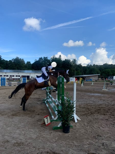 For sale is a 19-year-old experienced gelding named Quintio, affectionately called Quinni by us. He is completely reliable with a calm and balanced temperament. Quinni is well-behaved in handling, human-oriented, and shows a quiet, steady demeanor under saddle. He is always cooperative and eager to learn. Quinni forgives rider mistakes and provides his rider with confidence. He is a true dependable partner. In daily handling, he is uncomplicated and well-behaved (farrier-, loading-, and vet-friendly). Quinni is also very brave in the field, happily riding alone or in a group. He is calm in traffic and is familiar with various environments such as train tracks or asparagus fields. His clarity makes him an ideal children's pony, often ridden by a 6-year-old girl. Thanks to his previous successes in show jumping (placed at M level), he now makes an excellent experienced leisure partner for beginners and reiners, but also serves as a perfect schoolmaster for those gaining first competition experience. He also consistently shows effort in dressage. Quinni has been introduced to class E and is solidly trained up to class A, with some lessons started in class L.