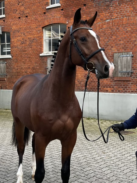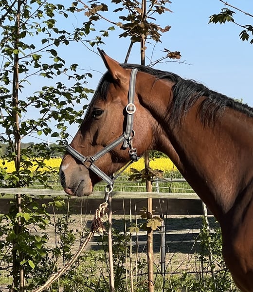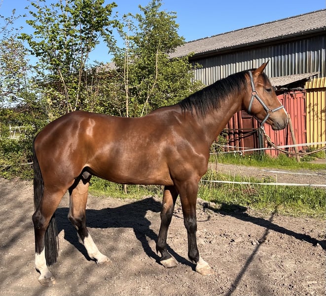 Brown son of Keaton (by Kannan-Contendro), born in April 2021. Alert, very correct gelding with good movements, awarded. Katu was gelded in March and has not been in training since then. He is well-behaved but cautious with new people. He was backed before being gelded and shows great potential in free jumping. He is familiar with trucks and trailers, round pens, and wash boxes. X-ray images including back are available and top quality. The mother, Hope, belongs to Holsteiner lineage 318A2 and has 51 points. Grandmother Jasmin produced the licensed stallions Conrad van de Mispelaere (show jumping 1.45m) and Quidams Acord, as well as the sport horses Queen (1.40m), Horse Gyms Joyfull (1.45m), and Veronika (1.30m). Direct maternal line of the Federal Champion Mare Dominique by Falcon. Father Keaton is currently being successfully presented by R. Bengtsson. Directly from the breeder, price negotiable.
