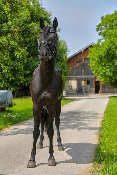 Zum Verkauf steht ein bildhübscher, ca. 165 cm großer Rappwallach von Diamant de Semilly x Barclay. Der modern und blütig aufgemachte Holsteiner wurde erst letztes Jahr schonend angeritten und verfügt über drei gute GGA sowie viel Vermögen, Mut und Go am Sprung. Bereits bei seinen ersten Turnierstarts in Dressurpferdeprüfungen der Klasse A und Einlaufspringprüfungen bis 90cm konnte er seine Qualität unter Beweis stellen und sich direkt platzieren. Der Wallach ist parcoursfertig und bereit für die ersten Springpferdeprüfungen der Klasse A. Ein hochinteressantes Nachwuchs- und Ausbildungspferd für den anspruchsvollen Springsport! Aufgrund seines jungen Alters ist Jungpferdeerfahrung Voraussetzungen und ein reiterliches Können auf A/L Niveau wünschenswert. Im Umgang ist er brav, unkompliziert und sehr menschenbezogen. Ebenso schmiede- und verladefromm. Eine aktuelle AKU inkl. Röntgenbilder ohne Befund liegt vor! Anfragen bei ernsthaftem Interesse bitte nur telefonisch oder per WhatsApp unter +49 176 46187186