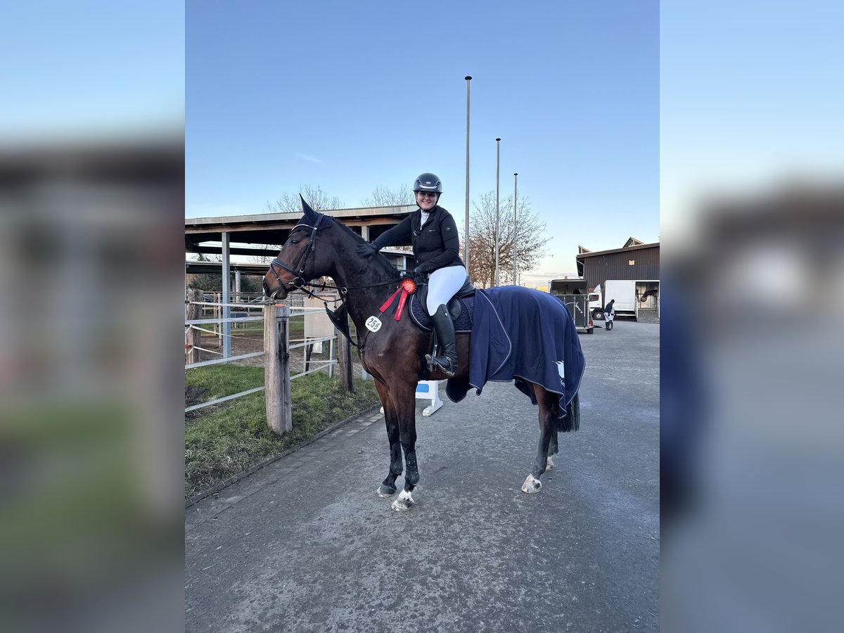 Holly K 3 is a 2015-born Holsteiner mare with a height of approximately 172 cm. She is a sporty, eager-to-perform mare with a lot of talent over fences and a good work attitude. In show jumping, she proves to be motivated, attentive, and reliable. She remains rideable and pleasant to handle at all times. She has already competed successfully up to 120 cm and has placed several times. Holly has a solid basic education, a good overview at the jumps, and the right attitude for further sporting development. In daily training, she is uncomplicated, eager to learn, and receptive to her rider. She is being offered at a fair price due to her cribbing behavior. This does not affect her performance in sport but should be considered in her management. I am looking for a suitable new home for her with an ambitious rider who appreciates her qualities and wishes to further develop her. A trial ride is, of course, possible by arrangement. Serious inquiries with a brief introduction are very welcome.