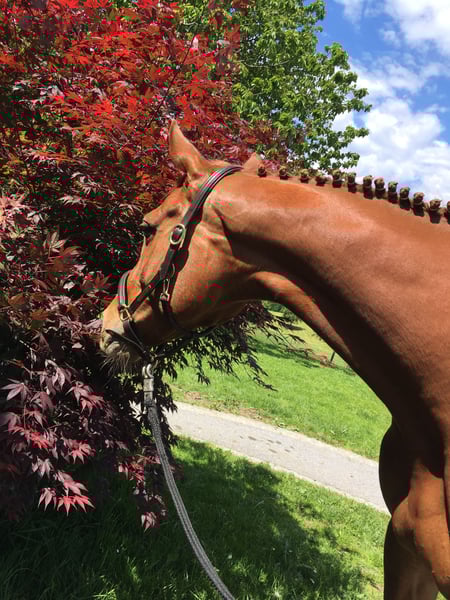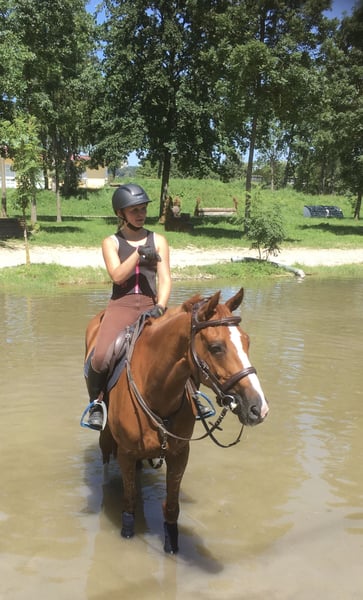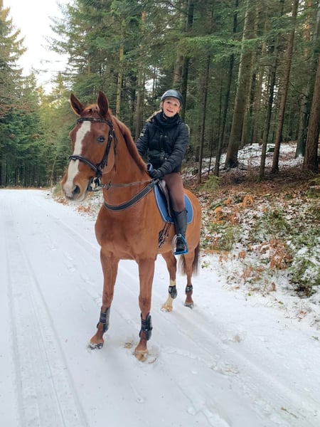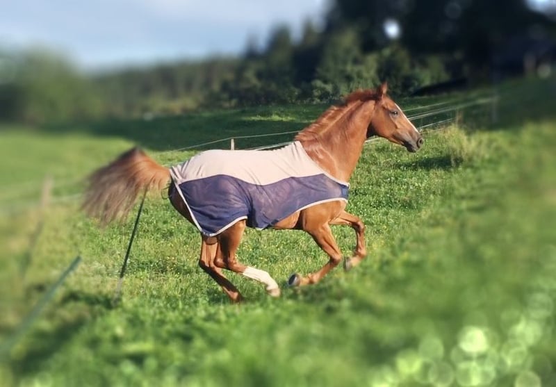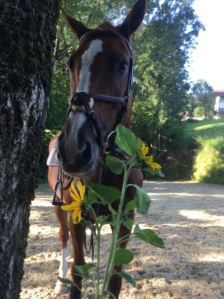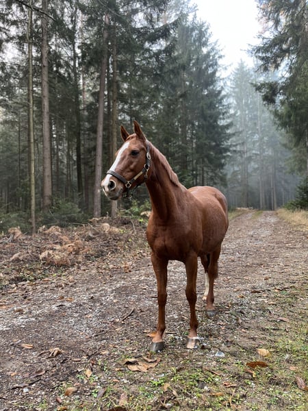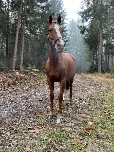 This stylish mare by Uriko x Caretino x Rebel Z is searching for her 100% soulmate. I personally trained her from the age of four, and she has competed up to 1.20 meters in show jumping. She is capable of performing all elementary dressage movements. Due to her strong ambition, she often appears tense and stressed during work in the arena. Her greatest passion is the outdoors. She loves hacking out and is very reliable in the field. She crosses any water, goes over bridges, and is familiar with all kinds of construction machinery, trucks, and agricultural equipment, always remaining calm and composed. She is easy to load alone, stands patiently at the blacksmith (currently being shod with hot shoes), and is accustomed to stable life. She has almost always been turned out full-time on pasture since she was a foal. She previously had a beautiful foal by Keaton, making her also interesting for breeding purposes. She is registered as a broodmare in Austria. Currently, she is ridden by a 12-year-old girl during riding lessons, where she tries her best but can sometimes become a bit wild. "Abby" lives with me on the farm. Unfortunately, we are two very different characters and just can't seem to connect. She deserves a person who appreciates her quite independent nature. It is ONLY the right environment and the right person that matter, not the price.