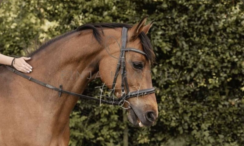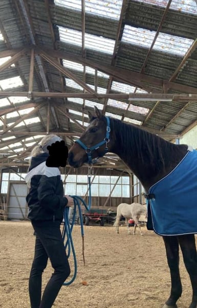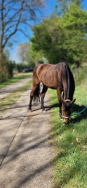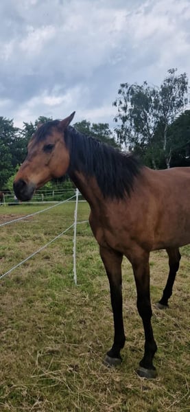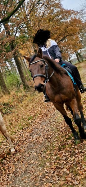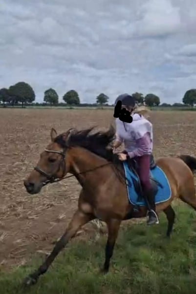 Hermine, 1,58m, 18 Jahre, ist von einem 13 jährigen, zierlichen Mädchen freizeitmäßig geritten. Hauptsächlich im Gelände, aber sie kennt auch die Arbeit in der Halle, unter dem Sattel und Bodenarbeit. Sie hat ein gut händelbares Temperament, deshalb für Reiter mit fortgeschrittenen Reitkenntnissen. Schmiede- und verladefromm. Mit komplettem , passendem Zubehör.
