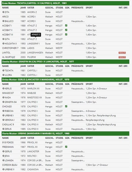 Szansa dla hodowców! Córka Concreto, Woruna, obecnie ma jeszcze źrebaka po Ermitage Kalone i w tym roku nie była kryta. Babcia Tschita po Capitol I x Calypso wydała niesamowite 11 koni skokowych, z których 3 startowały na poziomie 1,40 m, 2 na 1,50 m, a 2 na 1,60 m, oraz wydała 3 ogiery hodowlane. Ponadto, ogiery hodowlane Freeman i Chicago pochodzą bezpośrednio z linii matczynej Woruny. Trzecia matka, pańszczyźniana klacz Staatsprämienstute Graefin 84, jest zwyciężczynią konkursu S-Sieger.