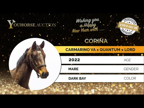 Corina is a beautiful dark brown, still youthful and long-lined mare with a light-footed way of moving. She jumps very well with her legs and shows a correct and quick technique. In motion, she displays a nice, carrying trot and a canter that shows balance and suppleness. Her jumping style is light, with a good take-off and correct use of her body, making her an interesting young prospect for the future. Her sire Carmarino VA, by Casall, is approved with Holstein and OS and competed himself up to 1.25 m level. He is known for passing on modern types with technique, mentality and good movement. Grandsire Casall competed at 1.60 m Grand Prix level and is one of the most influential sires in modern showjumping. The damline is very well proven. Dam Cumera, by Quantum, descends from a family that has produced sport horses for generations. The damline includes multiple horses that competed above 1.30 m level, such as GK Romy at 1.60 m, GK Casper successful at 1.60 m level, GK Quozient at 1.45 m, GK Quentin at 1.60 m and Fiona Harteveld competing at 1.40 m. The family also produced approved stallions, underlining the reliability of this line for sport and breeding Corina combines a youthful appearance, good technique and a light way of going with a proven performance pedigree, offering strong prospects for further development in sport.