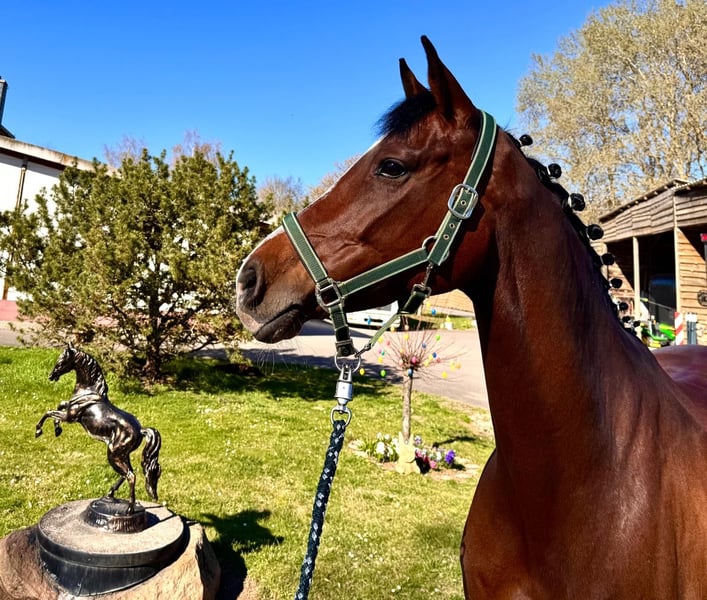Zum Verkauf steht eine hoch elegante und ehrgeizige Holsteiner Stute. Sie konnte bereits Sprpf. L (1,15m) gewinnen und sich in Sprpf.M (1,25m) bis an 2. Stelle platzieren. Mit ihrer Abstammung vereint sie aller bestes Holsteiner Blut., was sie auch für die Zucht hoch interessant macht. Ihr Bruder Casco PP war Ungarischer Meister der Chidren und mehrfach Nationenpreis platziert. Sie selber ist eine angagierte Partnerin und im täglichem Umgang sehr brav. Bei Interesse stehe wir gerne für weitere Informationen und eine Besichtigung zur Verfügung. Telefon: +49(0)171/4605744