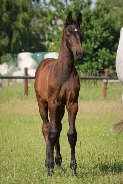 Foltto di stallone holsteiner di grande stazza, tipico e con forte espressione, da Charaktervoll da Mara - Catch - Colmann, ceppo 18A2, nato 05/2025, diventerà grigio, da allevamento familiare. È sveglio, attivo, forte nei movimenti, socievole e ama le coccole.