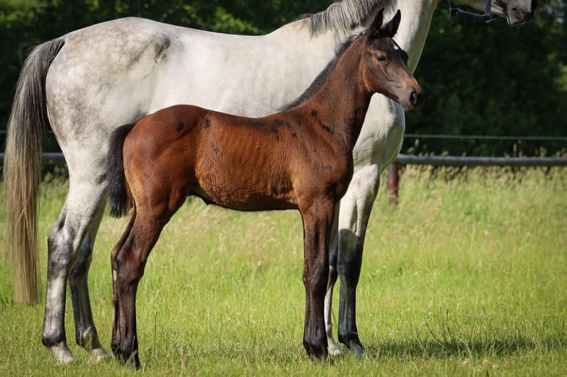 Potro de cría grande, con presencia y carácter, de pura raza Holsteiner, hijo de Charaktervoll de Mara - Catch - Colmann, línea 18A2, nacido en mayo de 2025. Se espera que sea de color gris. Criado en una familia de cría. Es un potro despierto, activo, con mucha energía para moverse, sociable con las personas y disfruta de las caricias.