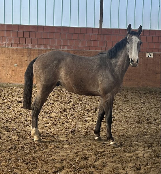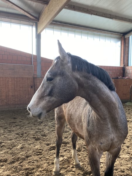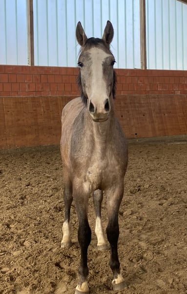 Im Auftrag wird ein sympathischer Hengst von Uriko x Quebec verkauft. Aufgrund unterschiedlich großer Hoden, kann der Hengst wohl nicht zur Körung vorgestellt werden. Röntgenbilder (inklusive Rücken) liegen vor, es wurden Veränderungen am Strahlbein festgestellt. Aufgrund dieser Befunde, wird der Hengst unter Wert verkauft. Die Mutter war mit der Züchterin 145 plaziert und mit ihrer Schwester siegreich in 140 Springen. Der Hengst hat einen sehr guten Charakter, drei gute Grundgangarten, springt mit Vermögen bei guter Vorsicht. Er steht auf gesunden Füßen/Hufen.