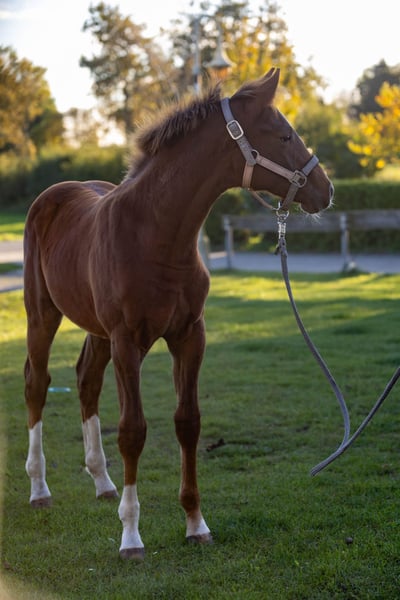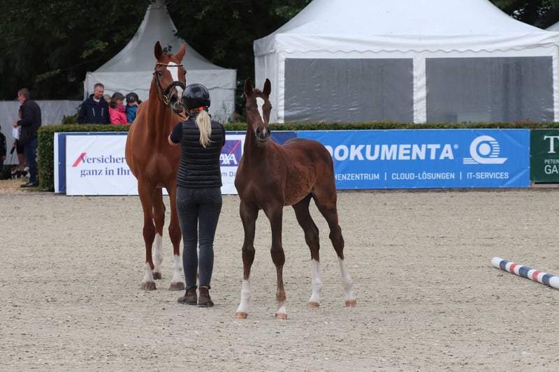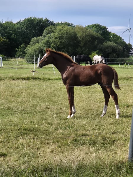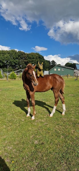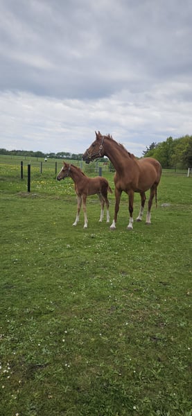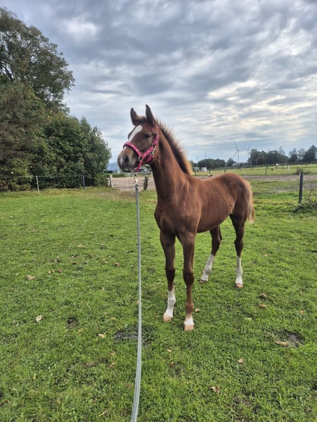 🏆 Award-winning champion foal with top lineage – typy, expressive movement, and a strong character! We are offering our beautiful, premium colt for sale, who has also successfully presented himself as a champion foal. He impresses with his friendly, outgoing personality and is very trusting, eager to learn, and balanced in daily handling. His movements are expressive, elastic, and ground-covering – a genuine young horse with potential for breeding and sport! The foal is raised appropriately in a mixed herd, regularly dewormed, introduced to the farrier, and will of course be delivered with a valid equine passport. 📍 25926 Ladelund 📅 Born: April 9, 2025 🔹 Gender: Colt 🔹 Color: Dark chestnut 🔹 Available: Immediately --- **Sire: Coeur Rouge (by Conthargos – Casall)** Coeur Rouge is a modern, typey, and performance-oriented stallion with excellent jumping talent. He descends from the top sire Conthargos, who has produced numerous international sport horses, and carries the best Holsteiner performance bloodlines through Casall. Coeur Rouge was awarded the main premium at the Oldenburg-International Jumping Horse Breeding Association (OS) and impresses with his dynamism, ability, and character. WFFS-negative tested – also of interest for breeding. --- **Dam: Claire de Lune 12 (by Catoki – Calido)** Claire de Lune 12 is awarded the district premium by the Holsteiner Verband and was successful up to M-level in show jumping competitions. She is by Catoki, the internationally successful Grand Prix show jumper, known for rideability, technique, and willingness to perform. Her sire Calido is one of the most influential sires in modern show jumping breeding, representing type, performance, and top character. Claire de Lune consistently passes these qualities to her offspring – the foal already shows a lot of expression, balance, and presence. --- This colt combines an excellent performance pedigree, premium conformation, and a remarkable character – a true young talent for breeding, sport, and show. For serious inquiries, we are happy to send additional photos, videos, and the full pedigree.