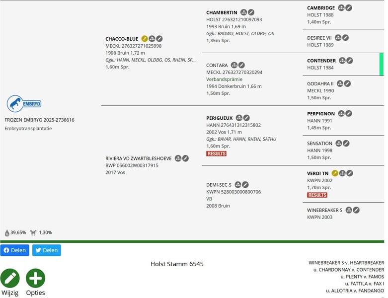 ## **CHACCO BLUE × RIVIERA VD ZWARTBLESHOEVE** ### Diepvries embryo | Ref. 2025-2736616 📍 Opgeslagen bij Aventea (Italië) --- ## 💎 EEN ZELDZAME KANS IN TOPGENETICA Een unieke mogelijkheid om een rechtstreekse nakomeling te verwerven van de legendarische **Chacco Blue** Gecombineerd met een krachtige merrielijn opgebouwd uit bewezen Grand Prix bloed. 👉 Dit embryo staat voor **pure topsportfokkerij** — gericht op het allerhoogste niveau. --- ## 🧬 PEDIGREE HIGHLIGHTS ### VADER: **Chacco Blue** * #1 WBFSH hengst wereldwijd * Producent van meerdere **1.60m Grand Prix paarden** * Bekend om **vermogen, reflexen en techniek** --- ### MOEDER: **Riviera van de Zwartbleshoeve** (**Perigueux × Verdi TN**) * Holsteiner stam **6545** * Groot kader, kracht en capaciteit * Combineert: ✔️ Perigueux → vermogen & voorzichtigheid ✔️ Verdi TN → bewezen 1.70m performer ✔️ Heartbreaker invloed → bloed & scherpte --- ## 🚀 SPORT- EN FOKPOTENTIE Deze combinatie is doelgericht gefokt voor: 🏆 **Topniveau sport (1.50m – 1.60m potentieel)** 🧬 Fokwaarde op lange termijn (zeker bij merrie) 💰 Hoge commerciële waarde 👉 Moderne sportpaardcombinatie met: * Duitse kracht en scope * Nederlands bloed en reflexen * Wereldtop vererving via Chacco Blue --- ## ❄️ KWALITEIT & OPSLAG 📍 Opgeslagen bij **Aventea** * Wereldtop in embryotechnologie * Professioneel ingevroren embryo * Klaar voor onmiddellijke transplantatie * Volledige documentatie beschikbaar --- ## 🌍 MARKTPOSITIE Perfect geschikt voor: * Professionele sportstallen * Topfokkers * Internationale investeerders ## ⚡ WAAROM DIT LOT OPVALT ✔️ Rechtstreekse Chacco Blue genetica ✔️ Bewezen Grand Prix moederlijn ✔️ Zeldzaam aanbod als diepvries embryo ✔️ Direct inzetbaar (geen wachttijd / geen flush risico) --- ## 🔒 BEPERKT BESCHIKBAAR Slechts **1 embryo beschikbaar** uit deze combinatie. --- ## 📩 INTERESSE Serieuze kandidaten kunnen aanvragen: * Volledige pedigree * Veterinaire info * Transport- en implantatiemogelijkheden --- **“Oorspronkelijk geselecteerd voor eigen fokprogramma”**