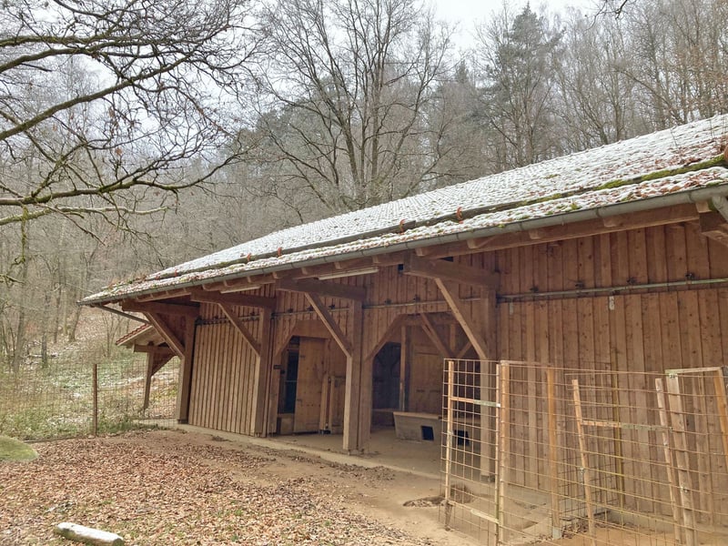 Ein großzügiger Offenstall für bis zu vier Pferde, zwei Notboxen, ein großes Heulager sowie eine etwa 5.000 m² große Pferdewiese ermöglichen eine artgerechte und komfortable Haltung direkt am Haus.