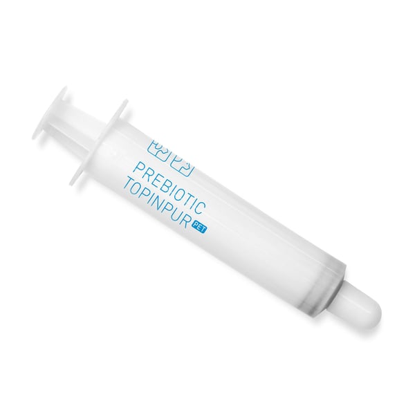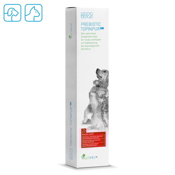 Fütterungsempfehlung: Hunde je 10 kg: 1 ml täglich, Hunde ab 50 kg: 5 ml täglich. Katzen: 1 ml täglich. Valetumed Prebiotic TopinPur Pet kann bis zu 4 Wochen oder nach Bedarf mehrmals im Jahr gegeben werden.