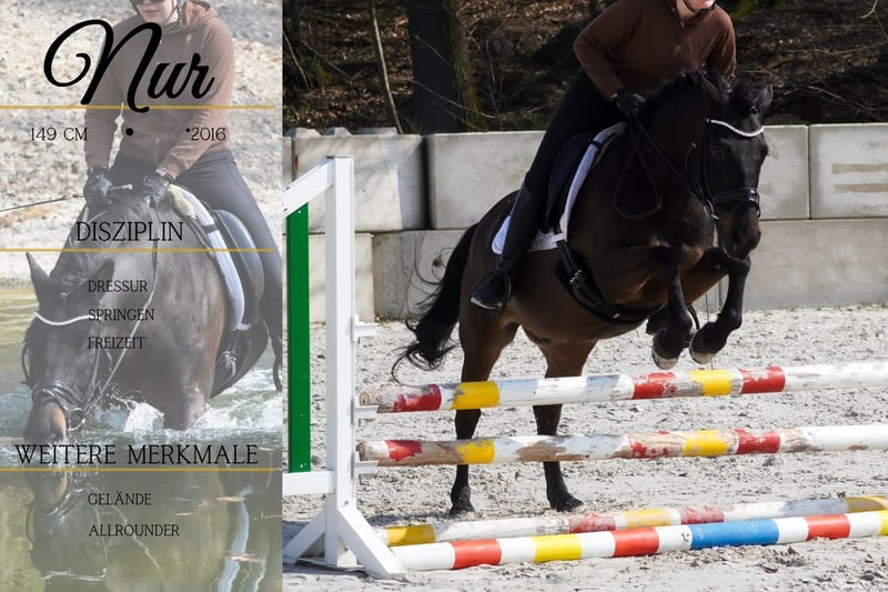 *NUR* is an absolute eye-catcher and irresistibly sweet. He is great to ride both in the arena and in the countryside, whether alone or in a group. New environments, roads, noise, etc., are no problem for him. He is easy to sit and of a calm nature. He jumps kindly and is suitable for children, nervous riders, and riding schools. !!! BE SURE TO WATCH HIS VIDEO !!! He covers well, and the rider in the video is 1.75 meters tall. Very uncomplicated and affectionate in handling. You will fall in love with NUR immediately.