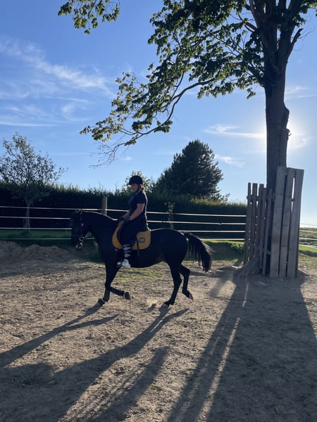 À vendre, une jument baie née en 2015 (âgée de 8 ans). Dakota est une jument issue d’un croisement entre un arabe et un Huzul, mesurant 1,50 m, ce qui convient à la plupart des cavaliers. Elle est très volontaire à apprendre et curieuse, veillant toujours à faire les choses correctement. En travail à la longe, elle se montre très concentrée et aborde toujours son partenaire avec respect. Elle aime également le travail en liberté, ce qui lui procure beaucoup de plaisir. Elle connaît toutes les trois allures, aussi bien en balade qu’en manège. Elle saute aussi volontiers. Cependant, ce n’est pas une monture pour débutants, car elle doit encore gagner beaucoup de confiance en son cavalier. Une fois cette confiance établie, elle devient une partenaire très agréable, pleine d’énergie, mais cela reste gérable. Dakota est très sensible, elle a besoin d’une personne calme, patiente et expérimentée. Koko est pieds nus et vit au pré. Elle n’est pas adaptée à un usage en école d’équitation. Pour tout intérêt sérieux, n’hésitez pas à me contacter.