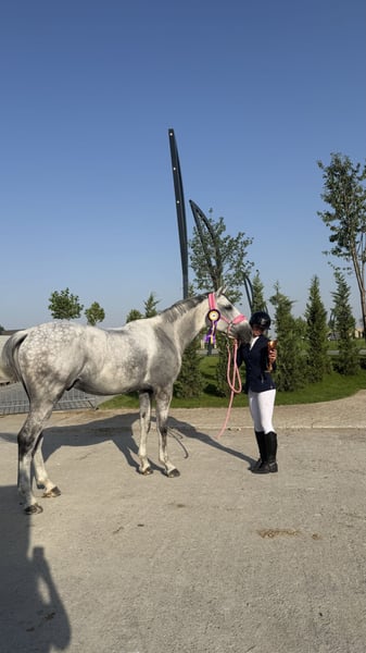 Milton (JPC Modesto x Quasar x Quito du Baussy) (2016, 167 cm) is a very well-trained and calm sport horse. He has competed in 1.20 m classes with a professional rider and 1.00 m classes with amateur girls (winning many competitions). He very rarely touches a rail. He often achieves the best time in the class without rushing, and he is able to turn easily. He has no bad habits — he does not bite or kick; he stands well for shoeing, loads easily into the trailer, and enjoys hacking out in nature. Milton (JPC Modesto x Quasar x Quito du Baussy) (2016, 167cm) este un cal de sport foarte lucrat și cuminte. A evoluat în probe de 1.20 cu un călăreț profesionist și probe de 1m cu fete amatoare (multe probe câștigate). Foarte rar lovește o bară. Scoate des cel mai bun timp din probă, fără să fugă, e capabil să se întoarcă ușor. Fără obiceiuri proaste, nu mușcă , nu lovește; stă la potcovit, se încarcă ușor în remorcă și îi plac plimbările în natură.