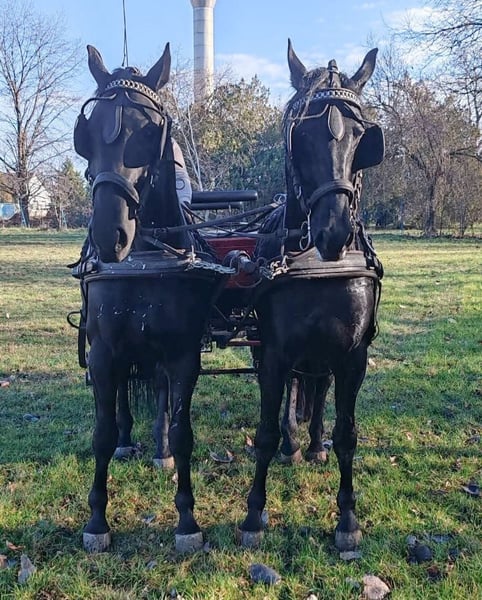 Zum Verkauf steht ein sehr gut zusammenarbeitendes Gespann aus zwei Wallachen der Rasse Ungarisches Warmblut! Beide Pferde verfügen über eine sehr gute Abstammung. Ihre Eltern und Großeltern waren erfolgreich im Fahrsport sowie in der Dressur, wodurch sie eine hervorragende genetische Grundlage besitzen. Der eine Wallach ist 5 Jahre alt und hat ein Stockmaß von 166 cm, der andere ist 6 Jahre alt mit 167 cm Stockmaß. Die Pferde zeichnen sich durch hervorragende geistige und körperliche Eigenschaften aus: -Ruhiges, ausgeglichenes Temperament. -Nervenstark und zuverlässig. -Sehr gehorsam und lernwillig. -Achten aufmerksam auf die Hilfen des Fahrers. -Arbeiten sehr gut zusammen im Gespann. -Mutig und sicher im Gelände und im Straßenverkehr. Sie sind harmonisch gebaut, gut bemuskelt und verfügen über eine sehr gute Ausdauer. Ihre Bewegungen sind elastisch, schwungvoll und korrekt. Bis zum Alter von 3,5 Jahren wuchsen sie in Offenstallhaltung auf. Danach begann unter der Leitung von professionellen Trainern ihre Ausbildung im Einspänner- und Zweispännerfahren. Nach ihrer Ausbildung nahmen sie an mehreren Amateur-Fahrturnieren teil – sowohl im Einspänner als auch im Zweispänner – und erzielten gute Ergebnisse. Die Pferde werden regelmäßig im Gelände und im Straßenverkehr gefahren und haben bereits an mehreren Jagden und Kutschenveranstaltungen teilgenommen. Beide Pferde sind vollständig gesund und verfügen über alle tierärztlichen Unterlagen. Dank ihres ruhigen Charakters und ihrer guten Ausbildung eignen sie sich auch sehr gut für Anfänger oder ältere Fahrer. Die Pferde können nach vorheriger Terminvereinbarung auf unserem Hof besichtigt und probegefahren werden. Transport innerhalb Europas kann organisiert werden. Für weitere Informationen, Fotos und Videos kontaktieren Sie uns bitte: Telefon / WhatsApp: +36 30 070 1784