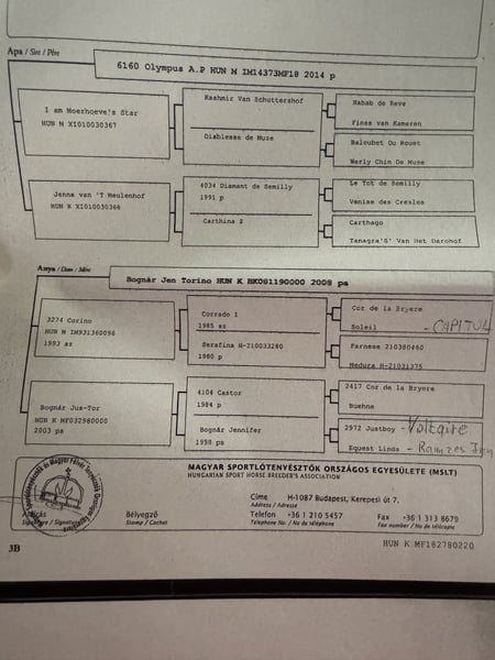 This beautiful and correctly built mare combines top-class show jumping lineage with a very balanced character. In her pedigree, she unites outstanding show jumping bloodlines, including Baloubet du Rouet, Diamant de Semilly, and Corrado I. The complete pedigree can be found in the attached pictures. • Very well-behaved in handling and under saddle – can also be ridden by children without any issues. • Uncomplicated, people-oriented, honest, and reliable. • Previously used as a broodmare, therefore no competition results yet – but shows a secure jumping technique and a lot of ability in training. • Ideal both as a sport horse for ambitious amateurs and for breeding, as she comes from the best international show jumping lines. For further information, pictures, and videos, please contact me by phone or WhatsApp at the number: +36 70 677 4446.