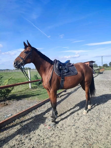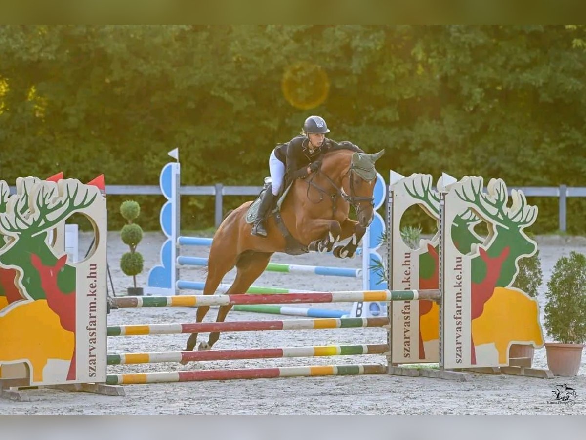 For sale is a 2017-born, approximately 16.1 hh light brown Hungarian Warmblood mare. This young lady has a friendly temperament and is well-behaved in handling. Under saddle, she moves obediently in all three gaits and has competed up to 1.10 m at shows, having also successfully cleared higher jumps in training without any issues. Due to her pronounced temperament and strong impulsion at the jump, she is not suitable for complete beginners, as she is very sensitive and attentive in the arena and aims to please her rider. The mare is currently shod in front, is familiar with the blacksmith, veterinarian, and loading and traveling.