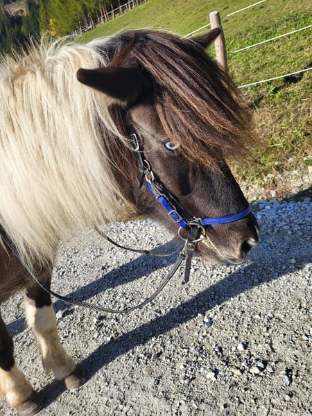 Tjörvi de Tröð IS2015180628 Hongre, 14.0 hh Mâle pie bleu avec un œil bleu Trotteur à quatre allures En Autriche depuis 2019 Exempt d’eczéma, ferré, vermifugé, à jour de ses vaccinations Ce cheval exceptionnellement beau séduit non seulement par sa couleur rare, mais aussi par ses allures, sa tranquillité et son caractère équilibré et amical. Il est poli avec les humains et les autres chevaux, curieux, intrépide et très sociable – un vrai charmeur. La circulation routière, le transport en van, le maréchand, les chiens, les poussettes, les tracteurs et les vélos ne lui posent aucun problème. Ce que nous souhaitons pour lui : Box en paddock avec compagnie Il ne supporte pas la vie en intérieur à cause de ses poumons Prix avec équipement, négociable : 12 500 € L’équipement est en excellent état : - Bride de randonnée de Flottur - Selle adaptée de la marque Eques avec couverture, girth et étriers Prix sans équipement : 11 000 € N’hésitez pas à me contacter si vous souhaitez le rencontrer. Il se trouve dans le magnifique Lungau, au Kirchnerhof. 0664/1225261