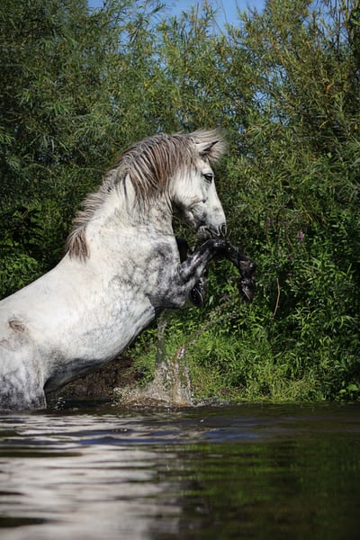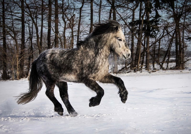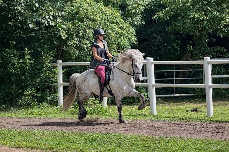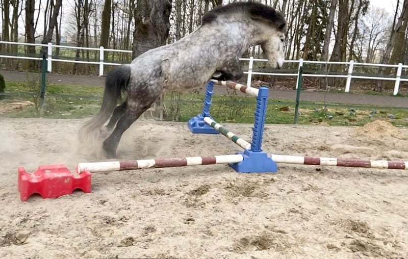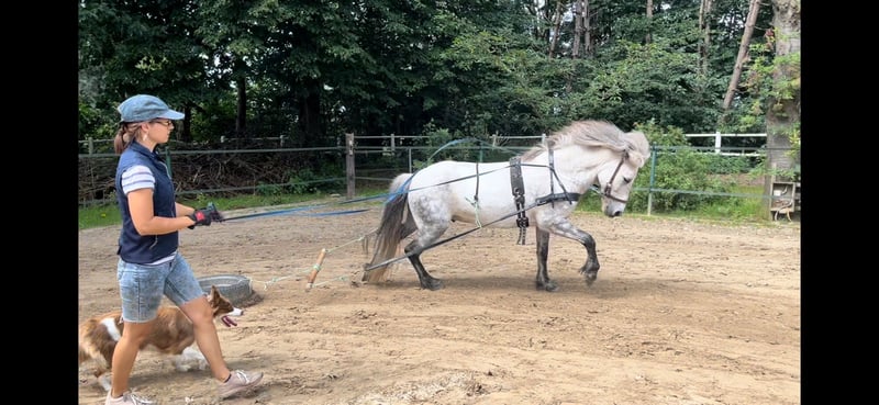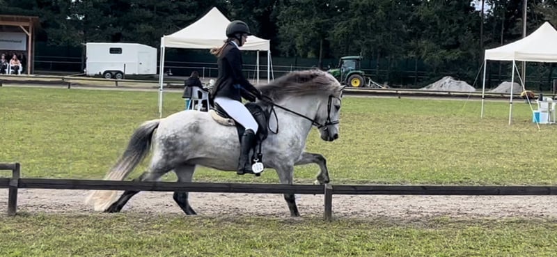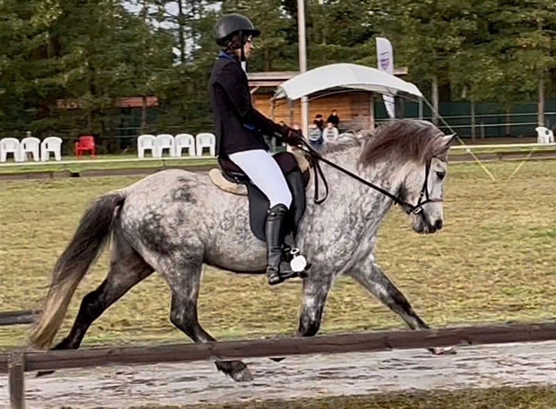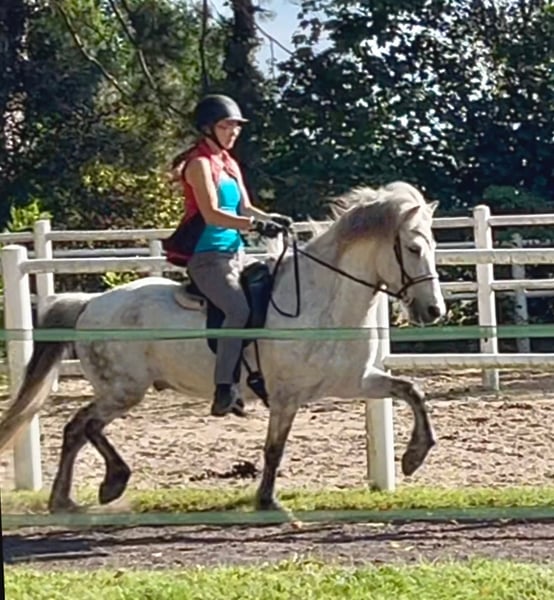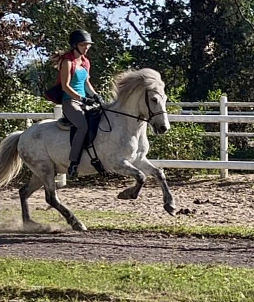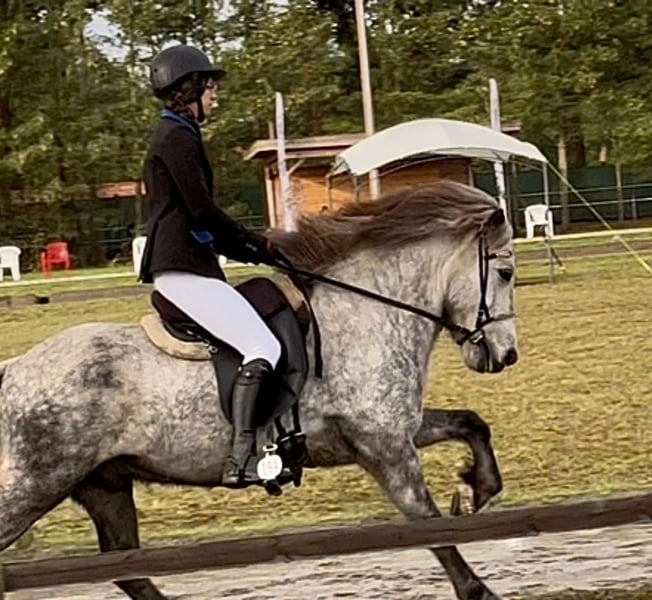 Juli ist ein 2011 Kontinental gezogener Wallach und ca 1,44m groß mit kräftigen Gelenken. Der hübsche Apfelschimmel benötigt einen einfühlsamen Menschen und ist genau das Richtige für einen anspruchsvollen Reiter. Er ist sehr fein ausgebildet und beherrscht zahlreiche Dressurlektionen (Trabverstärkung, Kurzkehrt aus dem Trab, Schulter herein in allen Gangarten, sowie Renverse, Schritttraversale, im Ausbau befindliche Trabtraversale, Außengalopp, Schrittpirouette und im Aufbau auch Galopppirouette, weitere Seitengänge, etc) Er ist Viergänger mit herausragenden Grundgangarten. Der Schritt unglaublich schreitend und mit viel Tempovarianz. Der Trab mit ausgeprägter Schwebephase und hochweiten Bewegungen, so wie deutlicher Tempoverstärkung. Der Galopp schön bergauf gesprungen, lässt sich sehr gut setzen. Ansonsten ist er sensibel und benötigt einen einfühlsamen, fortgeschrittenen Reiter, der weich in der Hand und konkret mit seinen Hilfen ist. Der Tölt ist nicht seine Gangart. Wir haben lange dran gearbeitet, aber er bleibt da leider trabig und es stresst ihn auch. Da er eine leichte Knieproblematik mitbringt (Instabilität), welche wir über Training und Muskelaufbau aber gut im Griff haben, vermute ich, dass der Tölt sich aufgrund der Knie nicht „stabilisieren“ lässt. Ich hab daher entschieden, ihn nur noch dreigängig zu reiten, was auch so beibehalten werden soll. Im Turniersport hat er Noten im Schritt bis 6,0, so wie für Trab und Galopp bis 6,5 bekommen. Wobei wir letztes Jahr kein Turnier geritten sind, ich aber viel Wert auf versammelnde Übungen gelegt habe, wodurch sich seine Gänge noch mal deutlich verbessert haben. Wenn er einem vertraut, kann man auch einiges an Blödsinn mit ihm machen. Im Bereich Zirzensik hat er auch bereits ein paar Dinge gelernt. Ansonsten kennt er Handarbeit, Freispringen, Kappzaum, Doppellonge, Schlepptraining. Er läuft am Fahrrad und beherrscht da auch Tempoverstärkungen im Trab. Er hat ein gutes Vorwärts und bringt viel Lauffreude mit sich. Daher kein Anfänger-oder Kinderpferd und eher für eine Bezugsperson. Juli wird von mir sowohl mit als auch ohne Gebiss geritten. Er wird regelmäßig osteopathisch durchgecheckt, Zähne wurden im Sommer gemacht, halbjährlich geimpft (inkl. West-Nil) und entwurmt. Kennt es auch barhuf zu laufen. Er ist sehr rangniedrig, da muss man etwas aufpassen, dass er genug Futter abbekommt und steht in gemischter Herde. Keine sonstigen Erkrankungen bekannt, ekzemfrei. Denkbar wäre auch ein Tausch gegen ein Verlasspferd mit wenig/ruhigem Temperament, welches auch problemlos von Kindern und Anfängern geritten werden kann (ein Wallach müsste zudem problemlos mit Stuten zusammenstehen können).