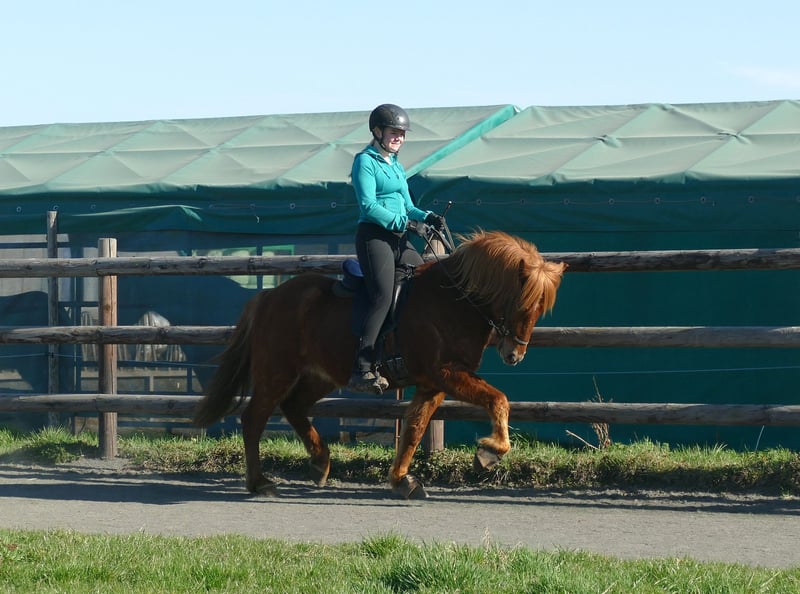 Rubino - Un fantastico Icelandic Horse da proseguire nell'addestramento 😊 Rubino si trova da poco in fase di formazione come cavallo da dressage e si dimostra coraggioso, desideroso di imparare e affidabile! Mostra un buon equilibrio tra trotto e tölt, ed è attualmente classificato come quattro-gaited. Ha un trotto fluido, ampio e con buon spazio, che già esegue molto bene al guinzaglio. Il tölt è sciolto, elastico e già si può notare che svilupperà una qualità di passo eccellente. Il giovane stallone è molto socievole e rende piacevole il lavoro quotidiano: la combinazione perfetta di vivace desiderio di lavorare e paziente apprendimento. È educato dal ferratore, conosce i cani, i trattori e tutto il trambusto del paddock. Rubino è all'inizio del suo percorso come cavallo da dressage e siamo assolutamente certi che diventerà un talento poliedrico con un carattere da sogno...(e già lo è!) Per ora è adatto a un cavaliere esperto. Tuttavia, poiché è ancora in fase di formazione, questa situazione potrebbe cambiare.